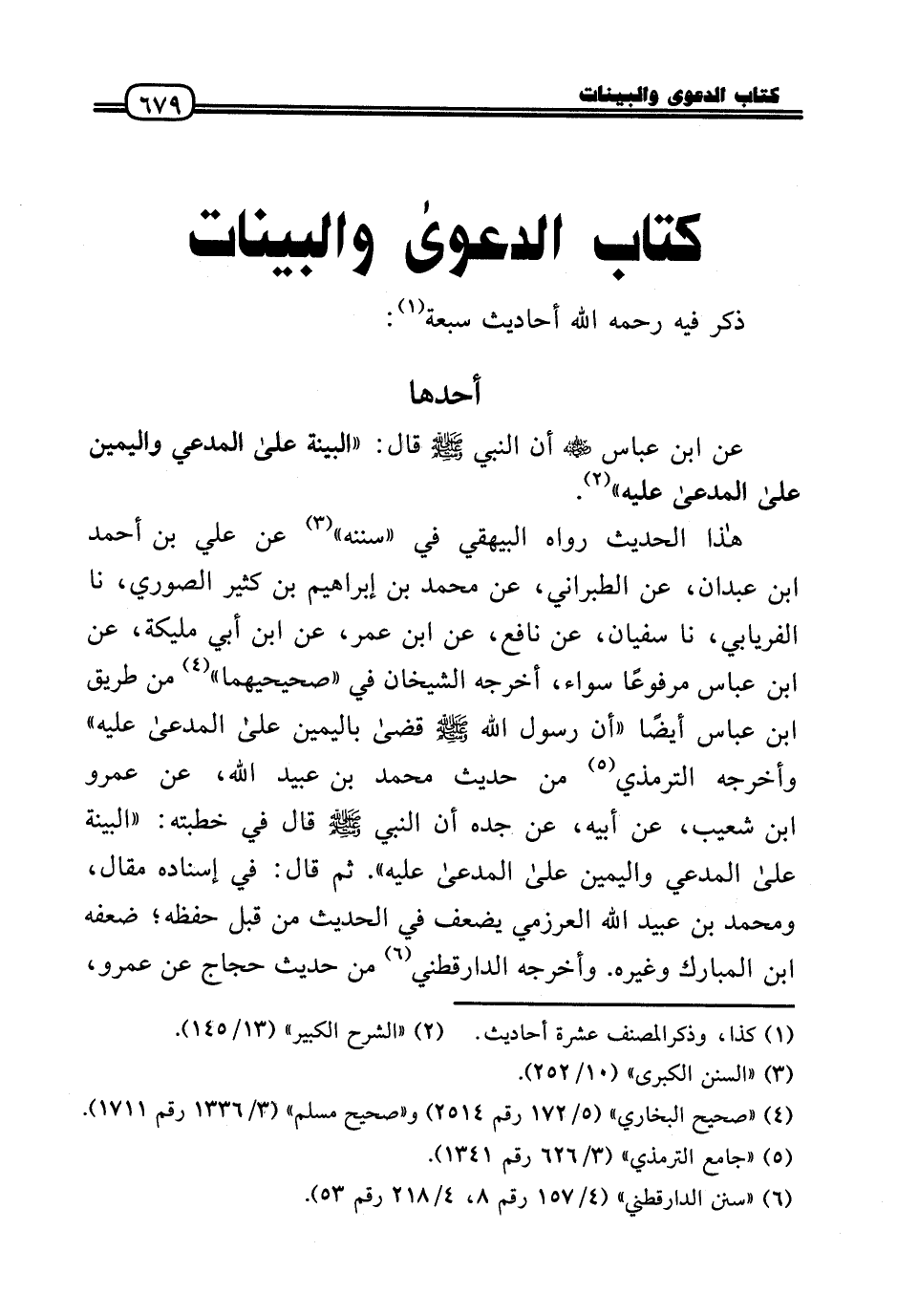 عَن ابْن عَبَّاس رَضِيَ اللَّهُ عَنْه أَن النَّبِي - صَلَّى الله عَلَيْهِ وَسلم - قَالَ: «الْبَيِّنَة عَلَى الْمُدَّعِي وَالْيَمِين عَلَى الْمُدعَى عَلَيْهِ» .