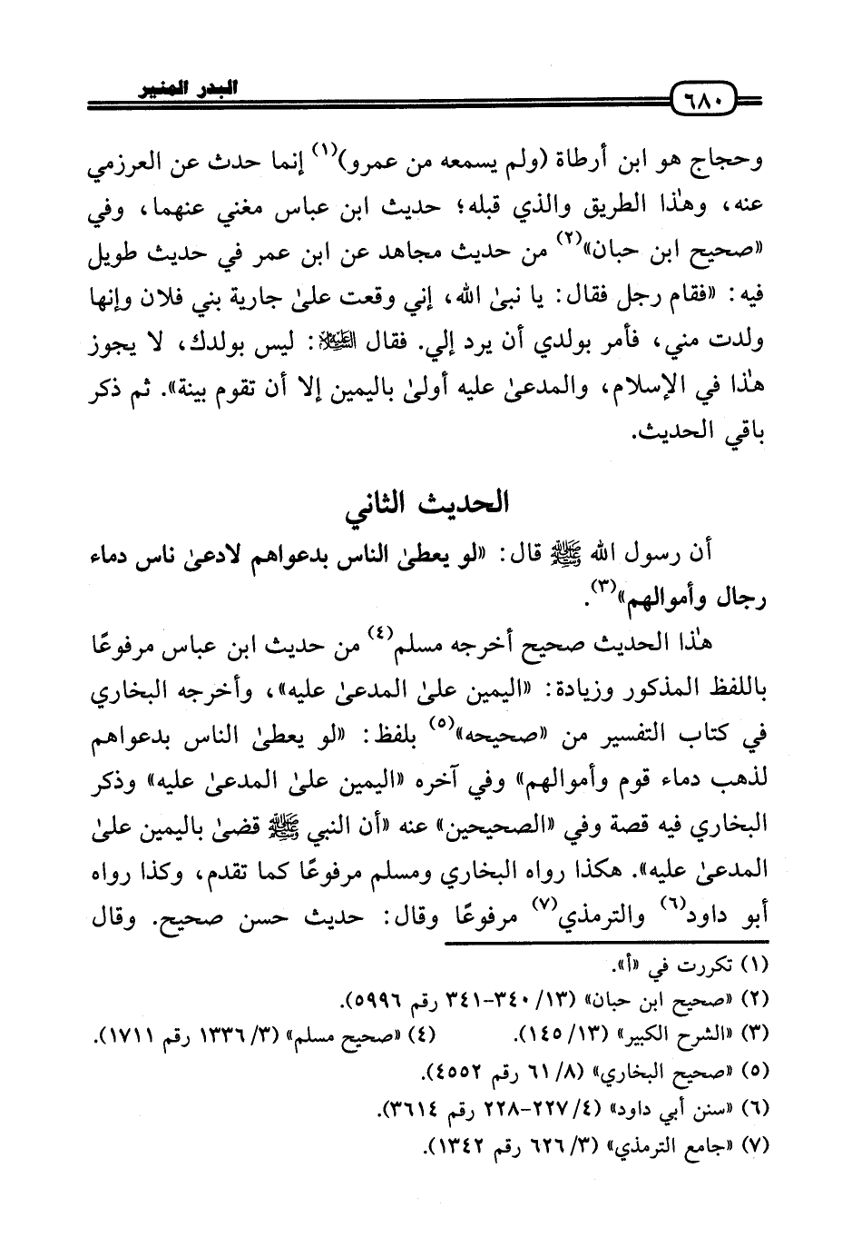 هَذَا الحَدِيث صَحِيح أخرجه مُسلم من حَدِيث ابْن عَبَّاس مَرْفُوعا بِاللَّفْظِ الْمَذْكُور وَزِيَادَة: «الْيَمين عَلَى الْمُدعَى عَلَيْهِ» ، وَأخرجه البُخَارِيّ فِي كتاب التَّفْسِير من «صَحِيحه» بِلَفْظ: «لَو يُعْطَى النَّاس بدعواهم لذهب دِمَاء قوم وَأَمْوَالهمْ» وَفِي آخِره «الْيَمين عَلَى الْمُدعَى عَلَيْهِ» وَذكر البُخَارِيّ فِيهِ قصَّة وَفِي «الصَّحِيحَيْنِ» عَنهُ «أَن النَّبِي - صَلَّى الله عَلَيْهِ وَسلم - قَضَى بِالْيَمِينِ عَلَى الْمُدعَى عَلَيْهِ» . هَكَذَا رَوَاهُ البُخَارِيّ وَمُسلم مَرْفُوعا كَمَا تقدم، وَكَذَا رَوَاهُ أَبُو دَاوُد وَالتِّرْمِذِيّ مَرْفُوعا وَقَالَ: حَدِيث حسن صَحِيح وَقَالَ