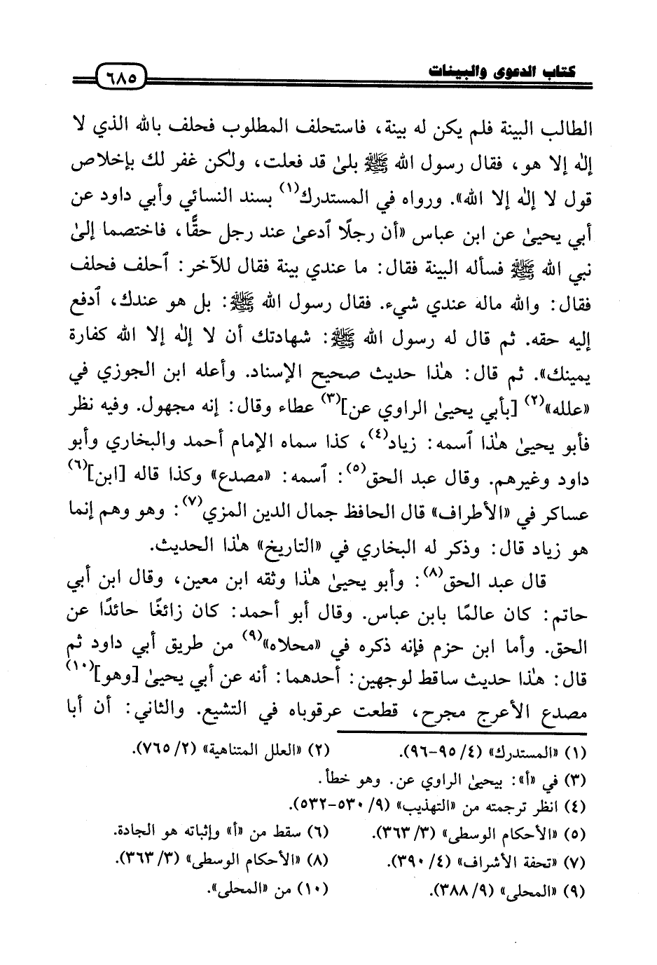 الطَّالِب الْبَيِّنَة فَلم يكن لَهُ بَيِّنَة، فاستحلف الْمَطْلُوب فَحلف بِاللَّه الَّذِي لَا إِلَه إِلَّا هُوَ، فَقَالَ رَسُول الله - صَلَّى الله عَلَيْهِ وَسلم - بلَى قد فعلت، وَلَكِن غفر لَك بإخلاص قَول لَا إِلَه إِلَّا الله» . وَرَوَاهُ فِي الْمُسْتَدْرك بِسَنَد النَّسَائِيّ وَأبي دَاوُد عَن أبي يَحْيَى عَن ابْن عَبَّاس «أَن رجلا ادَّعَى عِنْد رجل حقًّا، فاختصما إِلَى نَبِي الله - صَلَّى الله عَلَيْهِ وَسلم - فَسَأَلَهُ الْبَيِّنَة فَقَالَ: مَا عِنْدِي بَيِّنَة فَقَالَ للْآخر: احْلِف فَحلف فَقَالَ: وَالله مَاله عِنْدِي شَيْء. فَقَالَ رَسُول الله - صَلَّى الله عَلَيْهِ وَسلم -: بل هُوَ عنْدك، ادْفَعْ إِلَيْهِ حَقه. ثمَّ قَالَ لَهُ رَسُول الله - صَلَّى الله عَلَيْهِ وَسلم -: شهادتك أَن لَا إِلَه إِلَّا الله كَفَّارَة يَمِينك» . ثمَّ قَالَ: هَذَا حَدِيث صَحِيح الْإِسْنَاد. وَأعله ابْن الْجَوْزِيّ فِي «علله» بِيَحْيَى الرَّاوِي عَن عَطاء وَقَالَ: إِنَّه مَجْهُول. وَفِيه نظر فَأَبُو يَحْيَى هَذَا اسْمه: زِيَاد، كَذَا سَمَّاهُ الإِمَام أَحْمد وَالْبُخَارِيّ وَأَبُو دَاوُد وَغَيرهم. وَقَالَ عبد الْحق: اسْمه: «مصدع» وَكَذَا قَالَه [ابْن] عَسَاكِر فِي «الْأَطْرَاف» قَالَ الْحَافِظ جمال الدَّين الْمزي: وَهُوَ وهم إِنَّمَا هُوَ زِيَاد قَالَ: وَذكر لَهُ البُخَارِيّ فِي «التَّارِيخ» هَذَا الحَدِيث.