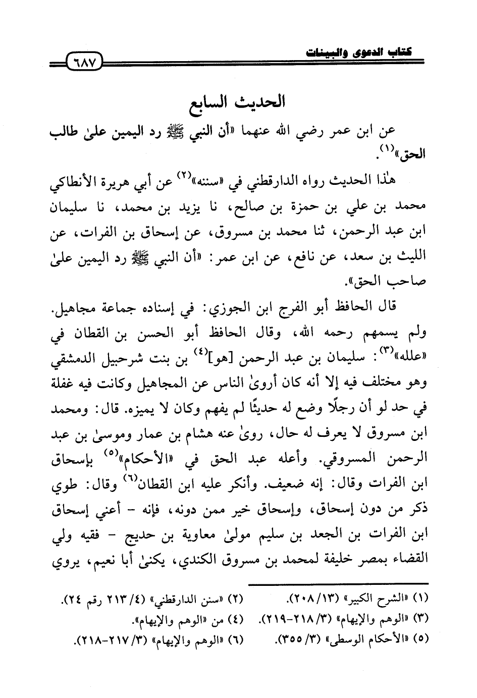 هَذَا الحَدِيث رَوَاهُ الدَّارَقُطْنِيّ فِي «سنَنه» عَن أبي هُرَيْرَة الْأَنْطَاكِي مُحَمَّد بن عَلّي بن حَمْزَة بن صَالح، نَا يزِيد بن مُحَمَّد، نَا سُلَيْمَان بن عبد الرَّحْمَن، ثَنَا مُحَمَّد بن مَسْرُوق، عَن إِسْحَاق بن الْفُرَات، عَن اللَّيْث بن سعد، عَن نَافِع، عَن ابْن عمر: «أَن النَّبِي - صَلَّى الله عَلَيْهِ وَسلم - رد الْيَمين عَلَى صَاحب الْحق» .