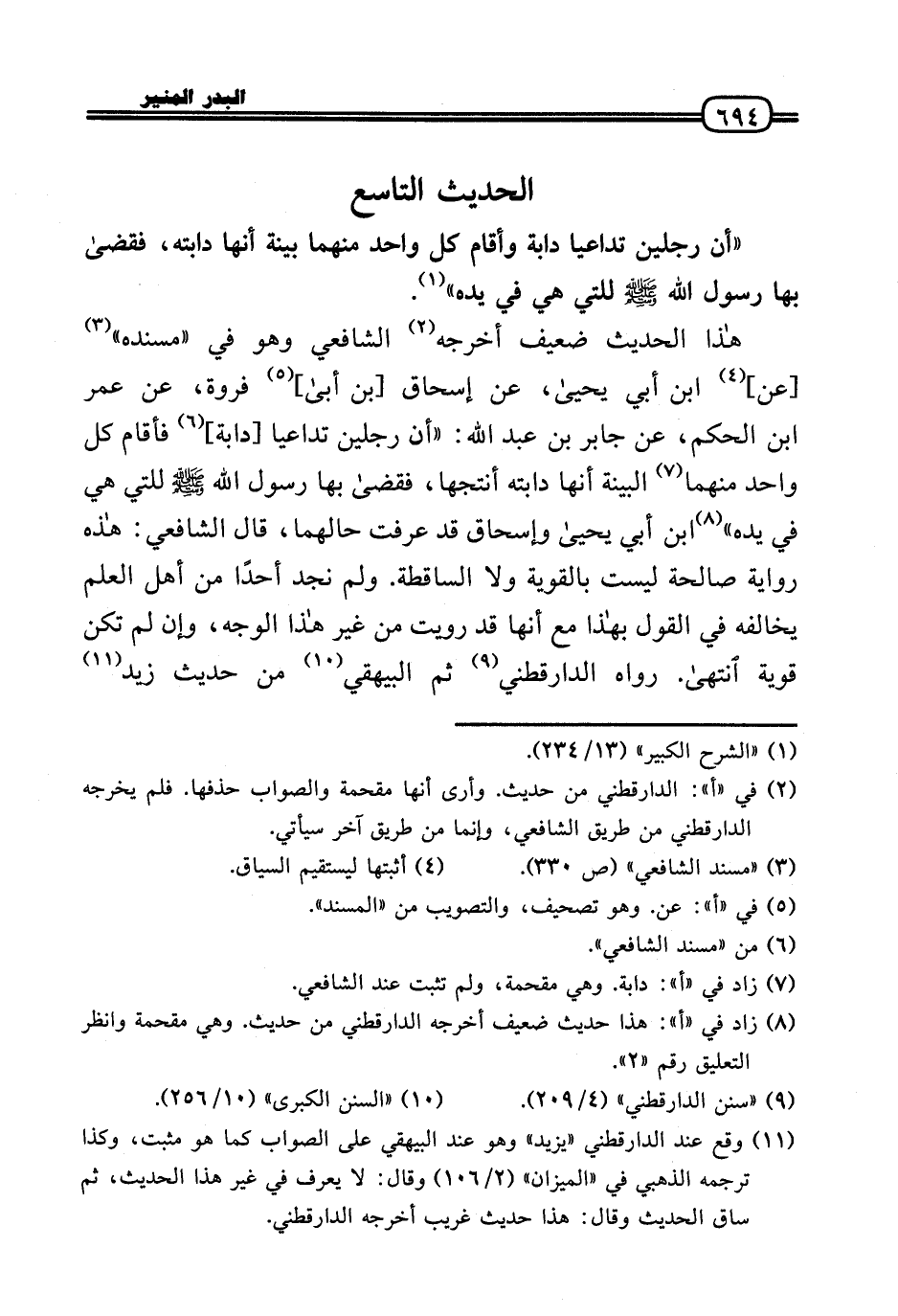 هَذَا الحَدِيث ضَعِيف أخرجه الشَّافِعِي وَهُوَ فِي «مُسْنده» [عَن] ابْن أبي يَحْيَى، عَن إِسْحَاق [بن أَبَى] فَرْوَة، عَن عمر بن الحكم، عَن جَابر بن عبد الله: «أَن رجلَيْنِ تداعيا [دَابَّة] فَأَقَامَ كل وَاحِد مِنْهُمَا الْبَيِّنَة أَنَّهَا دَابَّته أنتجها، فَقَضَى بهَا رَسُول الله - صَلَّى الله عَلَيْهِ وَسلم - للَّتِي هِيَ فِي يَده» ابْن أبي يَحْيَى وَإِسْحَاق قد عرفت حَالهمَا، قَالَ الشَّافِعِي: هَذِه رِوَايَة صَالِحَة لَيست بالقوية وَلَا الساقطة. وَلم نجد أحدا من أهل الْعلم يُخَالِفهُ فِي القَوْل بِهَذَا مَعَ أَنَّهَا قد رويت من غير هَذَا الْوَجْه، وَإِن لم تكن قَوِيَّة انْتَهَى. رَوَاهُ الدَّارَقُطْنِيّ ثمَّ الْبَيْهَقِيّ من حَدِيث زيد