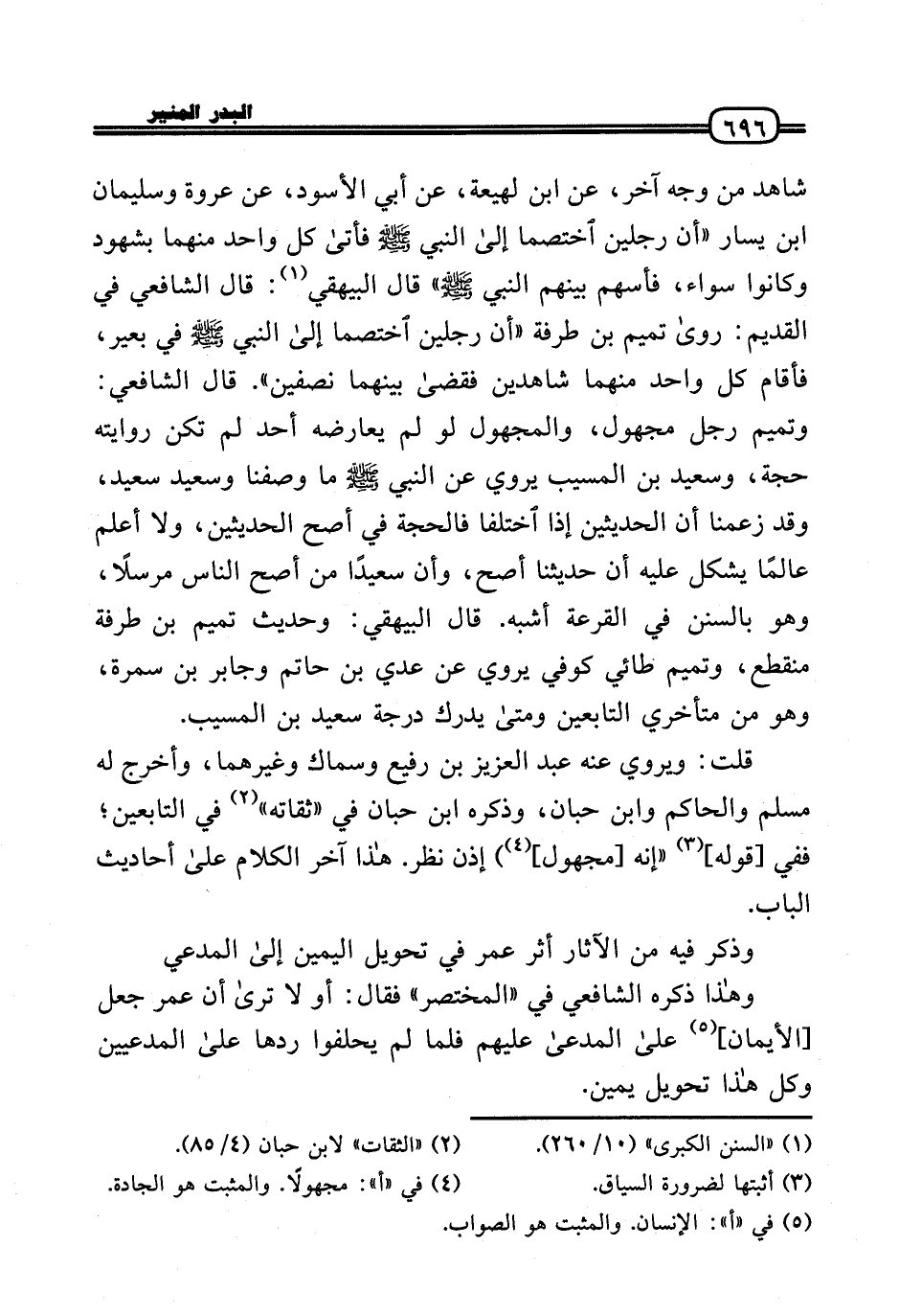 شَاهد من وَجه آخر، عَن ابْن لَهِيعَة، عَن أبي الْأسود، عَن عُرْوَة وَسليمَان بن يسَار «أَن رجلَيْنِ اخْتَصمَا إِلَى النَّبِي - صَلَّى الله عَلَيْهِ وَسلم - فَأَتَى كل وَاحِد مِنْهُمَا بِشُهُود وَكَانُوا سَوَاء، فَأَسْهم بَينهم النَّبِي - صَلَّى الله عَلَيْهِ وَسلم -» قَالَ الْبَيْهَقِيّ: قَالَ الشَّافِعِي فِي الْقَدِيم: رَوَى تَمِيم بن طرفَة «أَن رجلَيْنِ اخْتَصمَا إِلَى النَّبِي - صَلَّى الله عَلَيْهِ وَسلم - فِي بعير، فَأَقَامَ كل وَاحِد مِنْهُمَا شَاهِدين فَقَضَى بَينهمَا نِصْفَيْنِ» . قَالَ الشَّافِعِي: وَتَمِيم رجل مَجْهُول، والمجهول لَو لم يُعَارضهُ أحد لم تكن رِوَايَته حجَّة، وَسَعِيد بن الْمسيب يروي عَن النَّبِي - صَلَّى الله عَلَيْهِ وَسلم - مَا وَصفنَا وَسَعِيد سعيد، وَقد زَعمنَا أَن الْحَدِيثين إِذا اخْتلفَا فالحجة فِي أصح الْحَدِيثين، وَلَا أعلم عَالما يشكل عَلَيْهِ أَن حديثنا أصح، وَأَن سعيدًا من أصح النَّاس مُرْسلا، وَهُوَ بالسنن فِي الْقرعَة أشبه. قَالَ الْبَيْهَقِيّ وَحَدِيث تَمِيم بن طرفَة مُنْقَطع، وَتَمِيم طائي كُوفِي يروي عَن عدي بن حَاتِم وَجَابِر بن سَمُرَة، وَهُوَ من متأخري التَّابِعين وَمَتى يدْرك دَرَجَة سعيد بن الْمسيب.