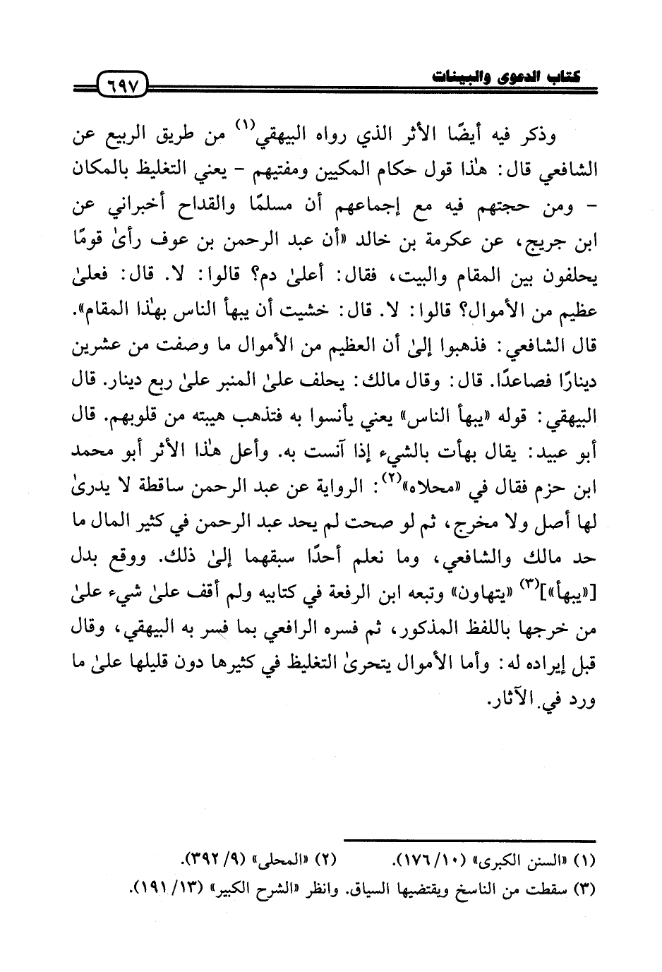 وَذكر فِيهِ أَيْضا الْأَثر الَّذِي رَوَاهُ الْبَيْهَقِيّ من طَرِيق الرّبيع عَن الشَّافِعِي قَالَ: هَذَا قَول حكام المكيين ومفتيهم - يَعْنِي التَّغْلِيظ بِالْمَكَانِ - وَمن حجتهم فِيهِ مَعَ إِجْمَاعهم أَن مُسلما والقداح أخبراني عَن ابْن جريج عَن عِكْرِمَة بن «خَالِد أَن عبد الرَّحْمَن بن عَوْف رَأَى قوما يحلفُونَ بَين الْمقَام وَالْبَيْت، فَقَالَ: أَعلَى دم؟ قَالُوا: لَا. قَالَ: فعلَى عَظِيم من الْأَمْوَال؟ قَالُوا: لَا. قَالَ: خشيت أَن يبهأ النَّاس بِهَذَا الْمقَام» . قَالَ الشَّافِعِي: فَذَهَبُوا إِلَى أَن الْعَظِيم من الْأَمْوَال مَا وصفت من عشْرين دِينَارا فَصَاعِدا. قَالَ: وَقَالَ مَالك يحلف عَلَى الْمِنْبَر عَلَى ربع دِينَار. قَالَ الْبَيْهَقِيّ: قَوْله «يبهأ النَّاس يَعْنِي يأنسوا بِهِ فتذهب هيبته من قُلُوبهم. قَالَ أَبُو عبيد: يُقَال بهأت بالشَّيْء إِذا آنست بِهِ. وأعل هَذَا الْأَثر أَبُو مُحَمَّد بن حزم فَقَالَ فِي «محلاه» : الرِّوَايَة عَن عبد الرَّحْمَن سَاقِطَة لَا يُدْرَى لَهَا أصل وَلَا مخرج، ثمَّ لَو صحت لم يحد عبد الرَّحْمَن فِي كثير المَال مَا حد مَالك وَالشَّافِعِيّ، وَمَا نعلم أحدا سبقهما إِلَى ذَلِك. وَوَقع بدل [يبهأ] يتهاون وَتَبعهُ ابْن الرّفْعَة فِي كِتَابيه وَلم أَقف عَلَى شَيْء عَلَى من خرجها بِاللَّفْظِ الْمَذْكُور، ثمَّ فسره الرَّافِعِيّ بِمَا فسر بِهِ الْبَيْهَقِيّ، وَقَالَ قبل إِيرَاده لَهُ: وَأما الْأَمْوَال يتَحَرَّى التَّغْلِيظ فِي كثيرها دون قليلها عَلَى مَا ورد فِي الْآثَار.