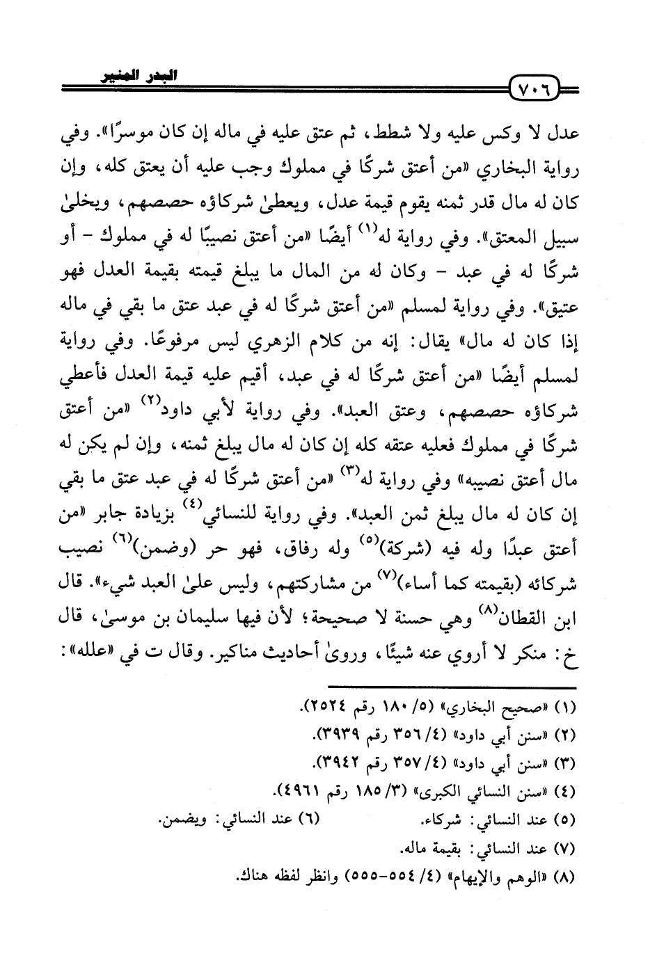 عدل لَا وكس عَلَيْهِ وَلَا شطط، ثمَّ عتق عَلَيْهِ فِي مَاله إِن كَانَ مُوسِرًا» . وَفِي رِوَايَة البُخَارِيّ «من أعتق شركا فِي مَمْلُوك وَجب عَلَيْهِ أَن يعْتق كُله، وَإِن كَانَ لَهُ مَال قدر ثمنه يقوم قيمَة عدل وَيُعْطَى شركاؤه حصصهم، ويخلى سَبِيل الْمُعْتق» . وَفِي رِوَايَة لَهُ أَيْضا «من أعتق نَصِيبا لَهُ فِي مَمْلُوك - أَو شركا لَهُ فِي عبد - وَكَانَ لَهُ من المَال مَا يبلغ قِيمَته بِقِيمَة الْعدْل فَهُوَ عَتيق» . وَفِي رِوَايَة لمُسلم «من أعتق شركا لَهُ فِي عبد عتق مَا بَقِي فِي مَاله إِذا كَانَ لَهُ مَال» يُقَال: إِنَّه من كَلَام الزُّهْرِيّ لَيْسَ مَرْفُوعا. وَفِي رِوَايَة لمُسلم أَيْضا «من أعتق شركا لَهُ فِي عبد أقيم عَلَيْهِ قيمَة الْعدْل فَأعْطِي شركاؤه حصصهم وَعتق العَبْد» . وَفِي رِوَايَة لأبي دَاوُد «من أعتق شركا فِي مَمْلُوك فَعَلَيهِ عتقه كُله إِن كَانَ لَهُ مَال يبلغ ثمنه، وَإِن لم يكن لَهُ مَال أعتق نصِيبه» وَفِي رِوَايَة لَهُ «من أعتق شركا لَهُ فِي عبد عتق مَا بَقِي إِن كَانَ لَهُ مَال يبلغ ثمن العَبْد» . وَفِي رِوَايَة للنسائي بِزِيَادَة جَابر «من أعتق عبدا وَله فِيهِ شركه وَله رفاق فَهُوَ حر وَضمن نصيب شركائه (بِقِيمَتِه كَمَا أَسَاءَ) من مشاركتهم وَلَيْسَ عَلَى العَبْد شَيْء» . قَالَ ابْن الْقطَّان: وَهِي حَسَنَة لَا صَحِيحَة؛ لِأَن فِيهَا سُلَيْمَان بن مُوسَى، قَالَ خَ: مُنكر لَا أروي عَنهُ شَيْئا، وَرَوَى أَحَادِيث مَنَاكِير وَقَالَ ت فِي «علله» :