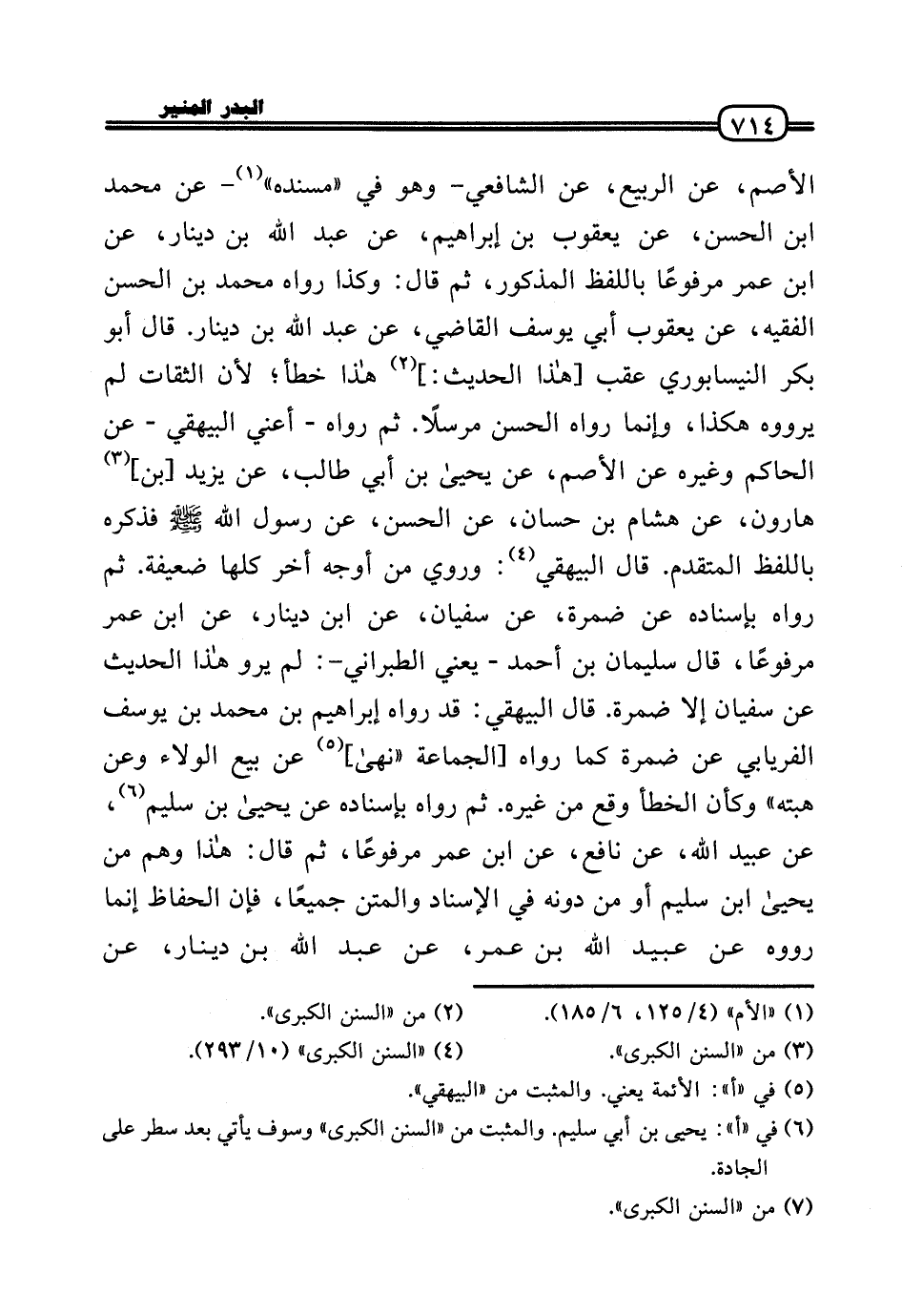 الْأَصَم، عَن الرّبيع، عَن الشَّافِعِي - وَهُوَ فِي «مُسْنده» - عَن مُحَمَّد بن الْحسن، عَن يَعْقُوب بن إِبْرَاهِيم، عَن عبد الله بن دِينَار، عَن ابْن عمر مَرْفُوعا بِاللَّفْظِ الْمَذْكُور، ثمَّ قَالَ: وَكَذَا رَوَاهُ مُحَمَّد بن الْحسن الْفَقِيه، عَن يَعْقُوب أبي يُوسُف القَاضِي، عَن عبد الله بن دِينَار قَالَ أَبُو بكر النَّيْسَابُورِي عقب [هَذَا الحَدِيث:] هَذَا خطأ؛ لِأَن الثِّقَات لم يرووه هَكَذَا، وَإِنَّمَا رَوَاهُ الْحسن مُرْسلا. ثمَّ رَوَاهُ - أَعنِي الْبَيْهَقِيّ - عَن الْحَاكِم وَغَيره عَن الْأَصَم، عَن يَحْيَى بن أبي طَالب، عَن يزِيد [بن] هَارُون، عَن هِشَام بن حسان، عَن الْحسن، عَن رَسُول الله - صَلَّى الله عَلَيْهِ وَسلم - فَذكره بِاللَّفْظِ الْمُتَقَدّم. قَالَ الْبَيْهَقِيّ: وَرُوِيَ من أوجه أخر كلهَا ضَعِيفَة. ثمَّ رَوَاهُ بِإِسْنَادِهِ عَن ضَمرَة، عَن سُفْيَان، عَن ابْن دِينَار، عَن ابْن عمر مَرْفُوعا، قَالَ سُلَيْمَان بن أَحْمد - يَعْنِي الطَّبَرَانِيّ -: لم يرو هَذَا الحَدِيث عَن سُفْيَان إِلَّا ضَمرَة. قَالَ الْبَيْهَقِيّ: قد رَوَاهُ إِبْرَاهِيم بن مُحَمَّد بن يُوسُف الْفرْيَابِيّ عَن ضَمرَة كَمَا رَوَاهُ يَعْنِي [الْجَمَاعَة «نهَى] عَن بيع الْوَلَاء وَعَن هِبته» وَكَأن الْخَطَأ وَقع من غَيره. ثمَّ رَوَاهُ بِإِسْنَادِهِ عَن يَحْيَى بن سليم، عَن عبيد الله، عَن نَافِع، عَن ابْن عمر مَرْفُوعا، ثمَّ قَالَ: هَذَا وهم من يَحْيَى بن سليم أَو من دونه فِي الْإِسْنَاد والمتن جَمِيعًا، فَإِن الْحفاظ إِنَّمَا رَوَوْهُ عَن عبيد الله بن عمر، عَن عبد الله بن دِينَار، عَن