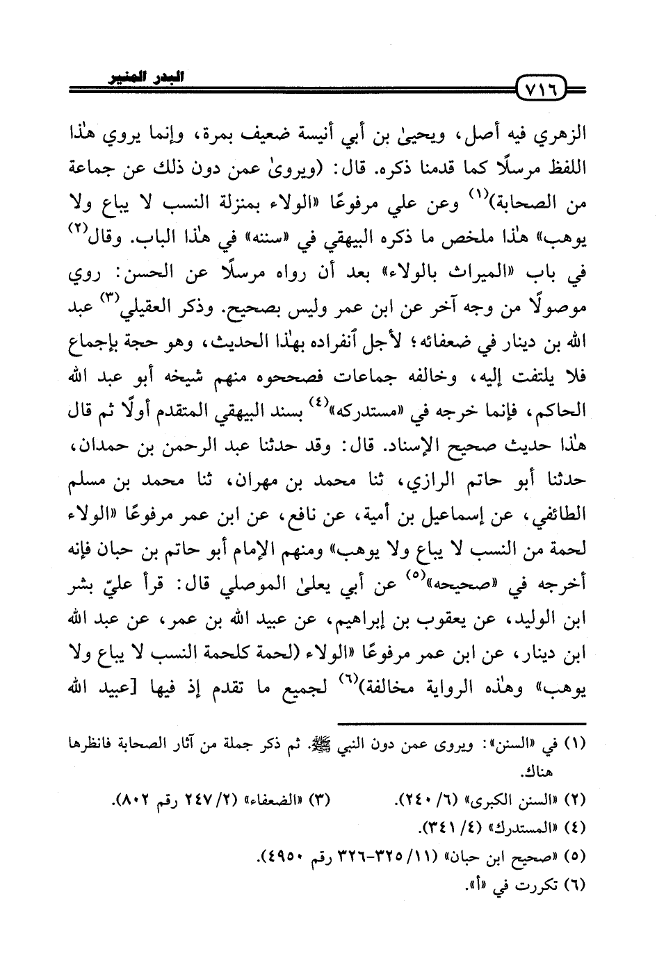الزُّهْرِيّ فِيهِ أصل، وَيَحْيَى بن أبي أنيسَة ضَعِيف بِمرَّة، وَإِنَّمَا يروي هَذَا اللَّفْظ مُرْسلا كَمَا قدمنَا ذكر. قَالَ: (وَيروَى عَمَّن دون ذَلِك عَن جمَاعَة من الصَّحَابَة) وَعَن عَلّي مَرْفُوعا «الْوَلَاء بِمَنْزِلَة النّسَب لَا يُبَاع وَلَا يُوهب» هَذَا ملخص مَا ذكره الْبَيْهَقِيّ فِي «سنَنه» فِي هَذَا الْبَاب. وَقَالَ فِي بَاب «الْمِيرَاث بِالْوَلَاءِ» بعد أَن رَوَاهُ مُرْسلا عَن الْحسن: رُوِيَ مَوْصُولا من وَجه آخر عَن ابْن عمر وَلَيْسَ بِصَحِيح. وَذكر الْعقيلِيّ عبد الله بن دِينَار فِي ضُعَفَائِهِ؛ لأجل انْفِرَاده بِهَذَا الحَدِيث، وَهُوَ حجَّة بِإِجْمَاع فَلَا يلْتَفت إِلَيْهِ، وَخَالفهُ جماعات فصححوه مِنْهُم شَيْخه أَبُو عبد الله الْحَاكِم، فَإِنَّمَا خرجه فِي «مُسْتَدْركه» بِسَنَد الْبَيْهَقِيّ الْمُتَقَدّم أَولا ثمَّ قَالَ هَذَا حَدِيث صَحِيح الْإِسْنَاد. قَالَ: وَقد حَدثنَا عبد الرَّحْمَن بن حمدَان، حَدثنَا أَبُو حَاتِم الرَّازِيّ، ثَنَا مُحَمَّد بن مهْرَان، ثَنَا مُحَمَّد بن مُسلم الطَّائِفِي، عَن إِسْمَاعِيل بن أُميَّة، عَن نَافِع، عَن ابْن عمر مَرْفُوعا «الْوَلَاء لحْمَة من النّسَب لَا يُبَاع وَلَا يُوهب» وَمِنْهُم الإِمَام أَبُو حَاتِم بن حبَان فَإِنَّهُ أخرجه فِي «صَحِيحه» عَن أبي يعْلى الْموصِلِي قَالَ: قَرَأَ عليّ بشر بن الْوَلِيد، عَن يَعْقُوب بن إِبْرَاهِيم، عَن عبيد الله بن عمر، عَن عبد الله بن دِينَار، عَن ابْن عمر مَرْفُوعا «الْوَلَاء (لحْمَة كلحمة النّسَب لَا يُبَاع وَلَا يُوهب» وَهَذِه الرِّوَايَة مُخَالفَة) لجَمِيع مَا تقدم إِذْ فِيهَا [عبيد الله