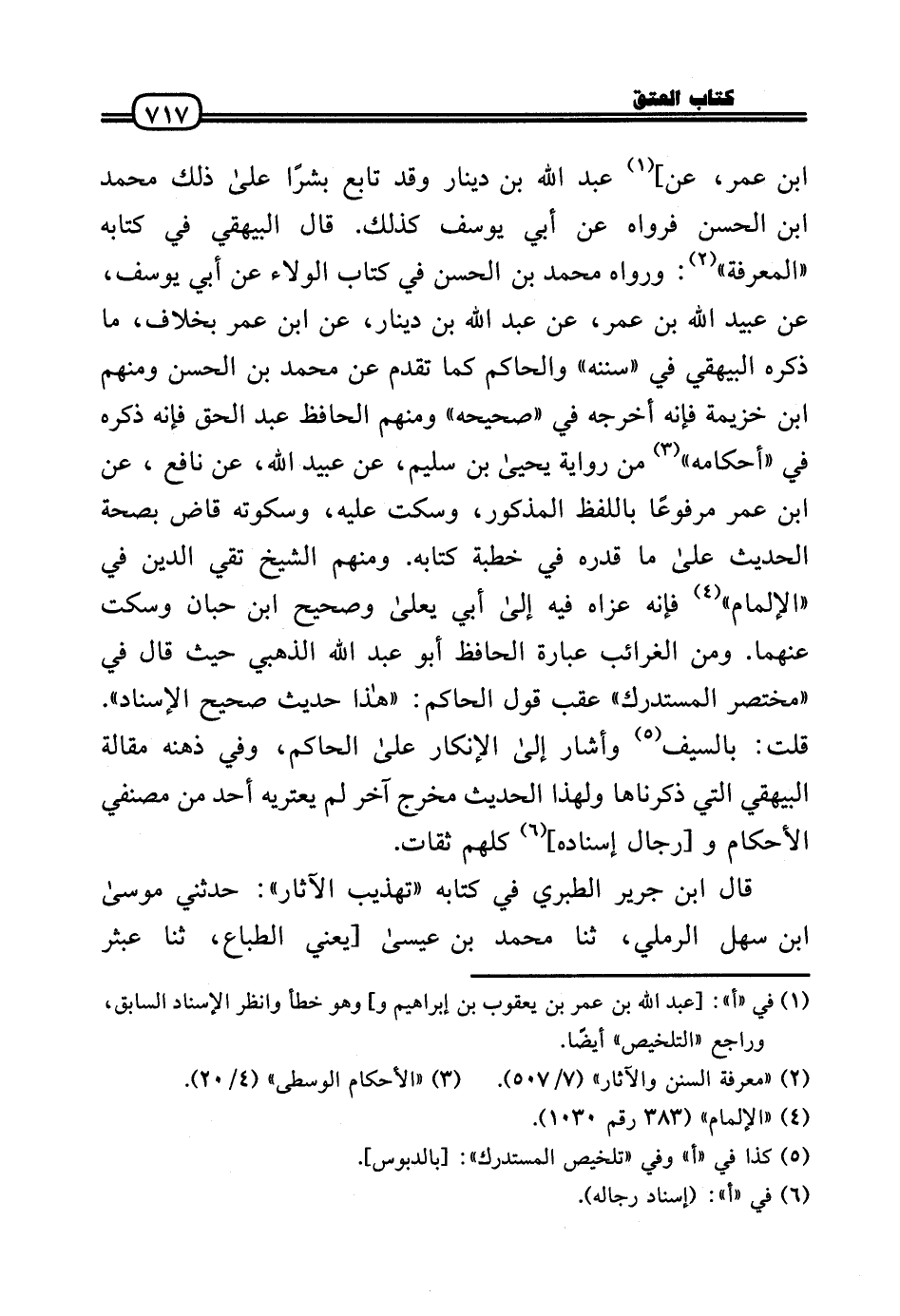 بن عمر، عَن] عبد الله بن دِينَار وَقد تَابع بشرا عَلَى ذَلِك مُحَمَّد بن الْحسن فَرَوَاهُ عَن أبي يُوسُف كَذَلِك. قَالَ الْبَيْهَقِيّ فِي كِتَابه «الْمعرفَة» : وَرَوَاهُ مُحَمَّد بن الْحسن فِي كتاب الْوَلَاء عَن أبي يُوسُف عَن عبيد الله بن عمر عَن عبد الله بن دِينَار عَن ابْن عمر - بِخِلَاف - مَا ذكره الْبَيْهَقِيّ فِي «سنَنه» وَالْحَاكِم كَمَا تقدم عَن مُحَمَّد بن الْحسن وَمِنْهُم ابْن خُزَيْمَة فَإِنَّهُ أخرجه فِي «صَحِيحه» وَمِنْهُم الْحَافِظ عبد الْحق فَإِنَّهُ ذكره فِي «أَحْكَامه» من رِوَايَة يَحْيَى بن سليم عَن عبيد الله عَن نَافِع عَن ابْن عمر مَرْفُوعا بِاللَّفْظِ الْمَذْكُور، وَسكت عَلَيْهِ وسكوته قَاض بِصِحَّة الحَدِيث عَلَى مَا قدره فِي خطْبَة كِتَابه وَمِنْهُم الشَّيْخ تَقِيّ الدَّين فِي «الْإِلْمَام» فَإِنَّهُ عزاهُ فِيهِ إِلَى أبي يعْلى وصحيح ابْن حبَان وَسكت عَنْهُمَا وَمن الغرائب عبارَة الْحَافِظ أَبُو عبد الله الذَّهَبِيّ حَيْثُ قَالَ فِي مُخْتَصر الْمُسْتَدْرك» عقب قَول الْحَاكِم: «هَذَا حَدِيث صَحِيح الْإِسْنَاد» . قلت: بِالسَّيْفِ وَأَشَارَ إِلَى الْإِنْكَار عَلَى الْحَاكِم، وَفِي ذهنه مقَالَة الْبَيْهَقِيّ الَّتِي ذَكرنَاهَا وَلِهَذَا الحَدِيث مخرج آخر لم يَعْتَرِيه أحد من مصنفي الْأَحْكَام ورجال إِسْنَاده كلهم ثِقَات.