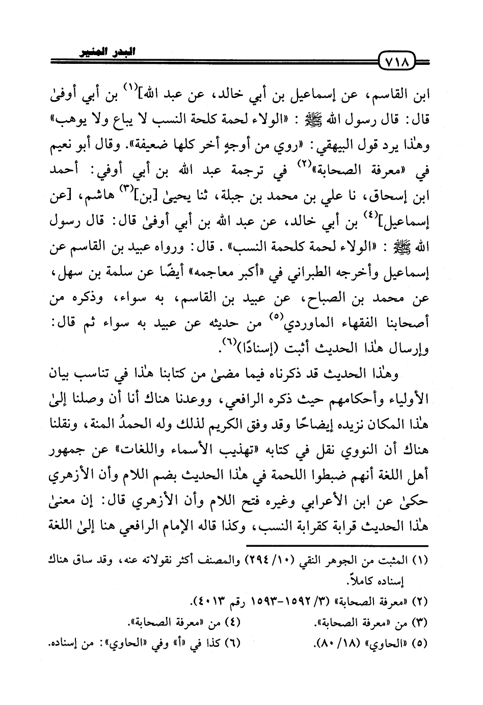 بن الْقَاسِم، عَن إِسْمَاعِيل بن أبي خَالِد، عَن عبد الله] بن أبي أَوْفَى قَالَ: قَالَ رَسُول الله - صَلَّى الله عَلَيْهِ وَسلم -: «الْوَلَاء لحْمَة كلحمة النّسَب لَا يُبَاع وَلَا يُوهب» وَهَذَا يرد قَول الْبَيْهَقِيّ: «رَوَى من أوجهٍ أخر كلهَا ضَعِيفَة» وَقَالَ أَبُو نعيم فِي «معرفَة الصَّحَابَة» فِي تَرْجَمَة عبد الله بن أبي أوفي: أَحْمد بن إِسْحَاق، نَا عَلّي بن مُحَمَّد بن جبلة، ثَنَا يَحْيَى هَاشم، [عَن إِسْمَاعِيل] بن أبي خَالِد، عَن عبد الله بن أبي أَوْفَى قَالَ: قَالَ رَسُول الله - صَلَّى الله عَلَيْهِ وَسلم -: «الْوَلَاء لحْمَة كلحمة النّسَب» قَالَ وَرَوَاهُ عبيد بن الْقَاسِم عَن إِسْمَاعِيل وَأخرجه الطَّبَرَانِيّ فِي «أكبر معاجمه» أَيْضا عَن سَلمَة بن سهل، عَن مُحَمَّد بن الصَّباح، عَن عتبَة بن الْقَاسِم، بِهِ سَوَاء، وَذكره من أَصْحَابنَا الْفُقَهَاء الْمَاوَرْدِيّ من حَدِيثه عَن عتبَة بِهِ سَوَاء ثمَّ قَالَ: وإرسال هَذَا الحَدِيث أثبت (إِسْنَادًا) .