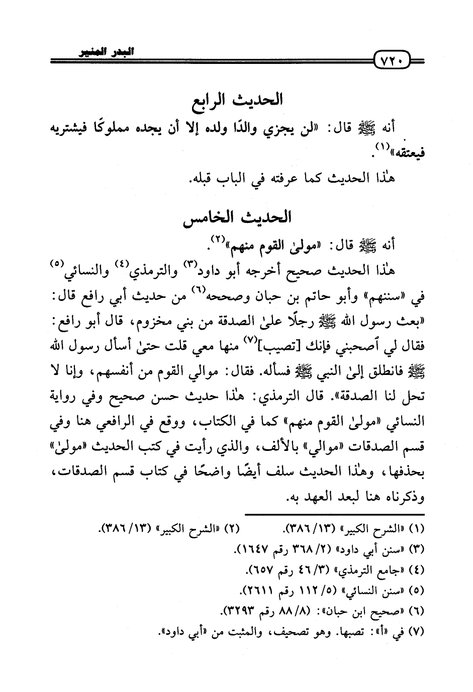 هَذَا الحَدِيث صَحِيح أخرجه أَبُو دَاوُد وَالتِّرْمِذِيّ وَالنَّسَائِيّ فِي «سُنَنهمْ» وَأَبُو حَاتِم بن حبَان وَصَححهُ من حَدِيث أبي رَافع قَالَ: بعث رَسُول الله - صَلَّى الله عَلَيْهِ وَسلم - رجلا عَلَى الصَّدَقَة من بني مَخْزُوم، قَالَ أَبُو رَافع: فَقَالَ لي اصحبني فَإنَّك [تصيب] مِنْهَا معي قلت حَتَّى أسأَل رَسُول الله - صَلَّى الله عَلَيْهِ وَسلم - فَانْطَلق إِلَى النَّبِي - صَلَّى الله عَلَيْهِ وَسلم - فَسَأَلَهُ فَقَالَ موَالِي الْقَوْم من أنفسهم وَإِنَّا لَا تحل لنا الصَّدَقَة. قَالَ التِّرْمِذِيّ: هَذَا حَدِيث حسن صَحِيح وَفِي رِوَايَة النَّسَائِيّ «مولَى الْقَوْم مِنْهُم» كَمَا فِي الْكتاب، وَوَقع فِي الرَّافِعِيّ هُنَا وَفِي قسم الصَّدقَات «موَالِي» بِالْألف، وَالَّذِي رَأَيْت فِي كتب الحَدِيث «مولَى» بحذفها، وَهَذَا الحَدِيث سلف أَيْضا وَاضحا فِي كتاب قسم الصَّدقَات، وَذَكَرْنَاهُ هُنَا لبعد الْعَهْد بِهِ.