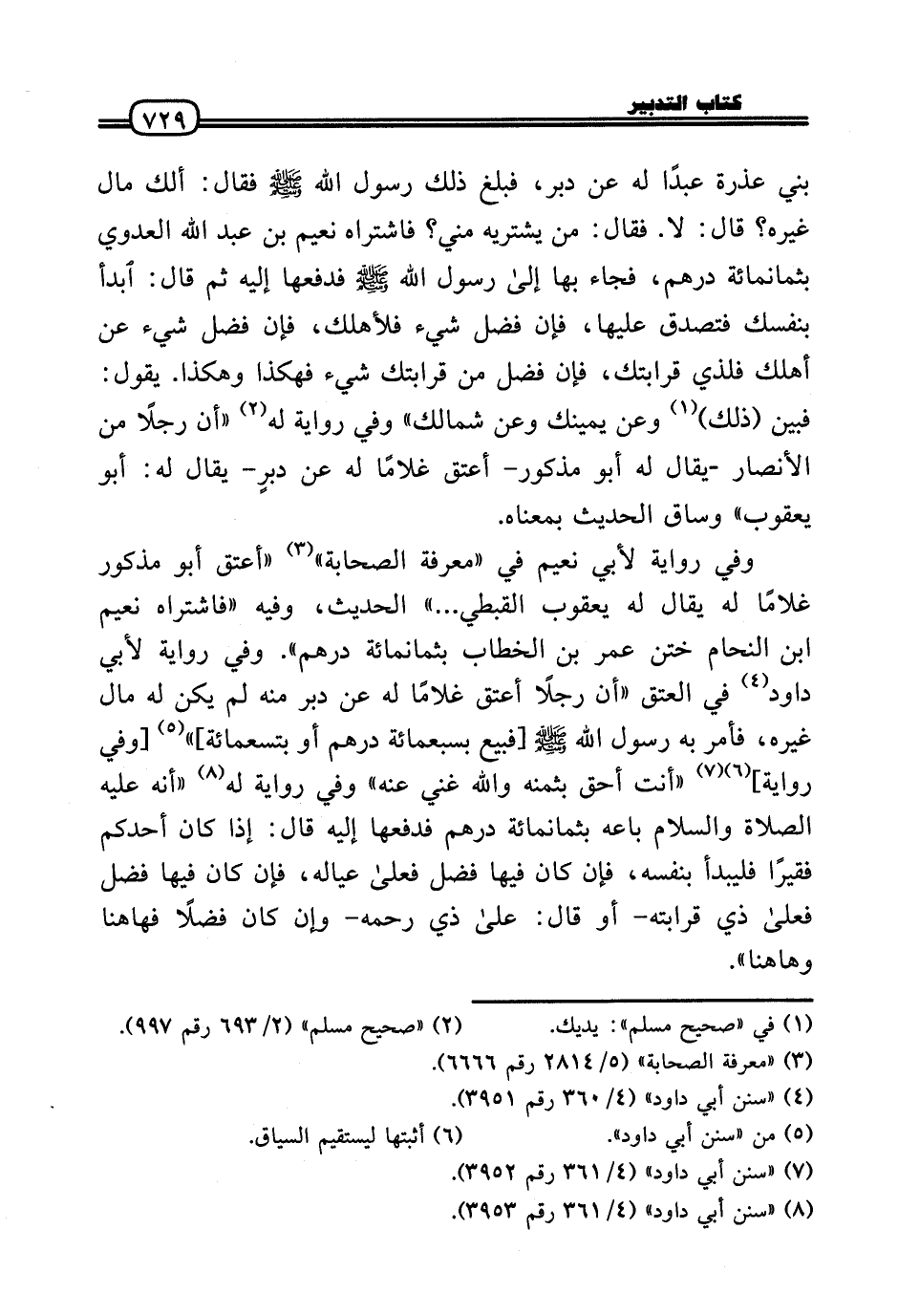 وَفِي رِوَايَة لأبي نعيم فِي «معرفَة الصَّحَابَة» «أعتق أَبُو مَذْكُور غُلَاما لَهُ يُقَال لَهُ يَعْقُوب القبطي ... » الحَدِيث، وَفِيه «فَاشْتَرَاهُ نعيم بن النحام ختن عمر بن الْخطاب بثمانمائة دِرْهَم» . وَفِي رِوَايَة لأبي دَاوُد فِي الْعتْق «أَن رجلا أعتق غُلَاما لَهُ عَن دبر مِنْهُ لم يكن لَهُ مَال غَيره فَأمر بِهِ رَسُول الله - صَلَّى الله عَلَيْهِ وَسلم -[فَبيع بسبعمائة دِرْهَم أَو بتسعمائة] » [وَفِي رِوَايَة] أَنْت أَحَق بِثمنِهِ وَالله غَنِي عَنهُ» وَفِي رِوَايَة لَهُ «أَنه عَلَيْهِ الصَّلَاة وَالسَّلَامُ بَاعه بثمانمائة دِرْهَم فَدَفعهَا إِلَيْهِ قَالَ: إِذا كَانَ أحدكُم فَقِيرا فليبدأ بِنَفسِهِ، فَإِن كَانَ فِيهَا فضل فعلَى عِيَاله، فَإِن كَانَ فِيهَا فضل فعلَى ذِي قرَابَته - أَو قَالَ: عَلَى ذِي رَحمَه - وَإِن كَانَ فضلا فهاهنا وَهَاهُنَا» .