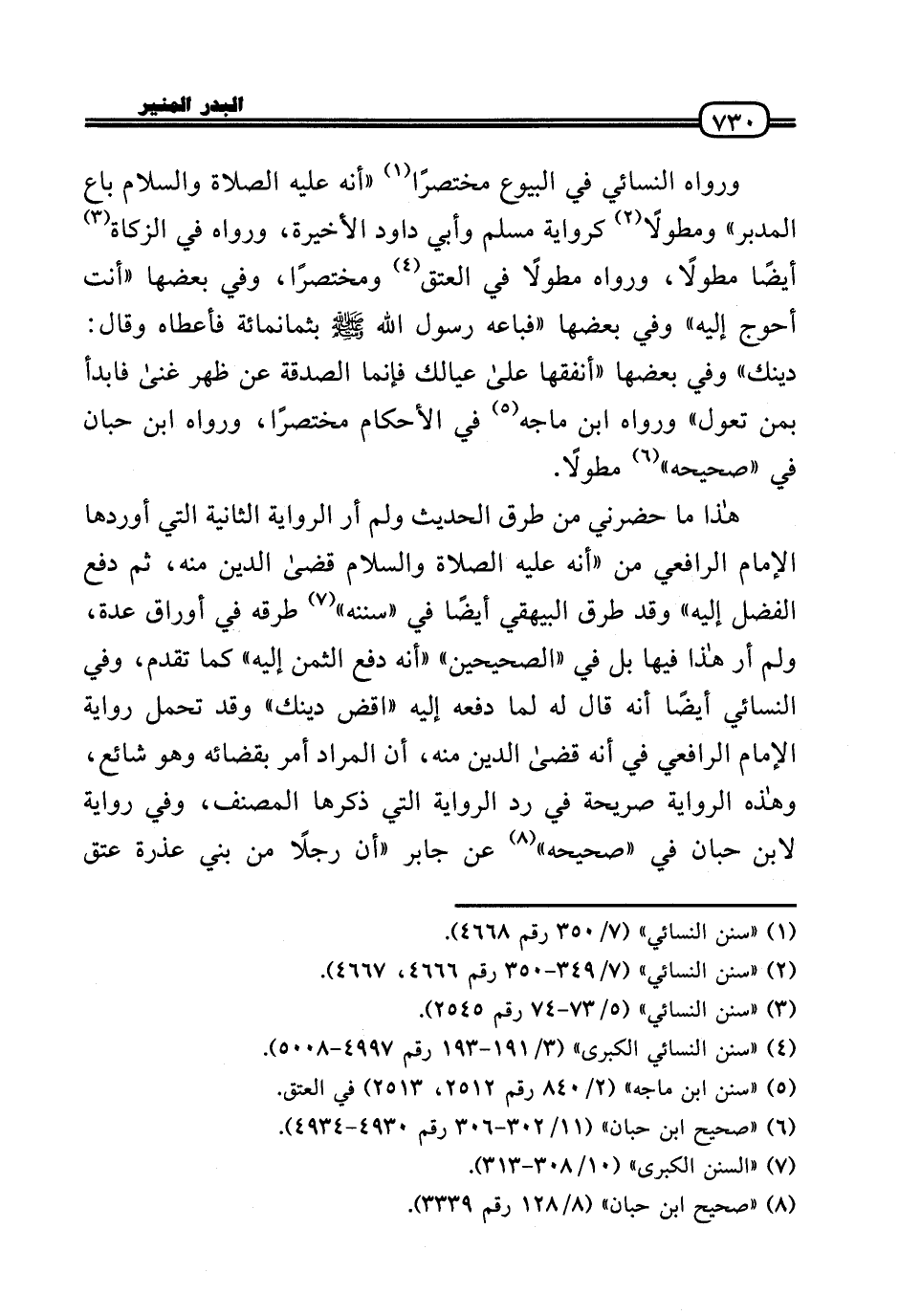 هَذَا مَا حضرني من طرق الحَدِيث وَلم أر الرِّوَايَة الثَّانِيَة الَّتِي أوردهَا الإِمَام الرَّافِعِيّ من «أَنه عَلَيْهِ الصَّلَاة وَالسَّلَامُ قَضَى الدَّين مِنْهُ، ثمَّ دفع الْفضل إِلَيْهِ» وَقد طرق الْبَيْهَقِيّ أَيْضا فِي «سنَنه» طرقه فِي أوراق عدَّة، وَلم أر هَذَا فِيهَا بل فِي «الصَّحِيحَيْنِ» «أَنه دفع الثّمن إِلَيْهِ» كَمَا تقدم، وَفِي النَّسَائِيّ أَيْضا أَنه قَالَ لَهُ لما دَفعه إِلَيْهِ «اقْضِ دينك» وَقد تحمل رِوَايَة الإِمَام الرَّافِعِيّ فِي أَنه قَضَى الدَّين مِنْهُ أَن المُرَاد أَمر بِقَضَائِهِ وَهُوَ شَائِع، وَهَذِه الرِّوَايَة صَرِيحَة فِي رد الرِّوَايَة الَّتِي ذكرهَا المُصَنّف، وَفِي رِوَايَة لِابْنِ حبَان فِي «صَحِيحه» عَن جَابر «أَن رجلا من بني عذرة عتق