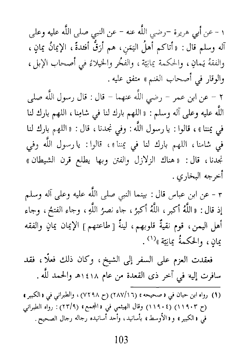 1 - عن أبي هريرة _ رضي الله عنه _ عن النبي صلى الله عليه وعلى آله وسلم قال: (أتاكم أهلُ اليَمَنِ، هم أرَقُّ أفئدةً، الإيمانُ يمانٍ، والفقهُ يَمانِ، والحكمة يمانِيّة، والفخُر والخيلاءُ في أصحاب الإبل، والوقار في أصحاب الغنم) متفق عليه.