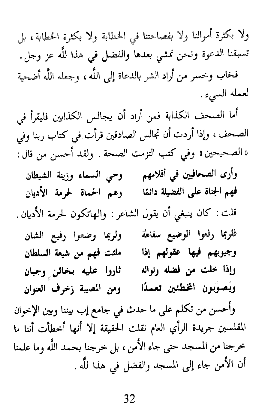 أما الصحف الكذابة فمن أراد أن يجالس الكذابين فليقرأ في الصحف، وإذا أردت أن تجالس الصادقين قرأت في كتاب ربنا وفي "الصحيحين" وفي كتب التزمت الصحة. ولقد أحسن من قال: