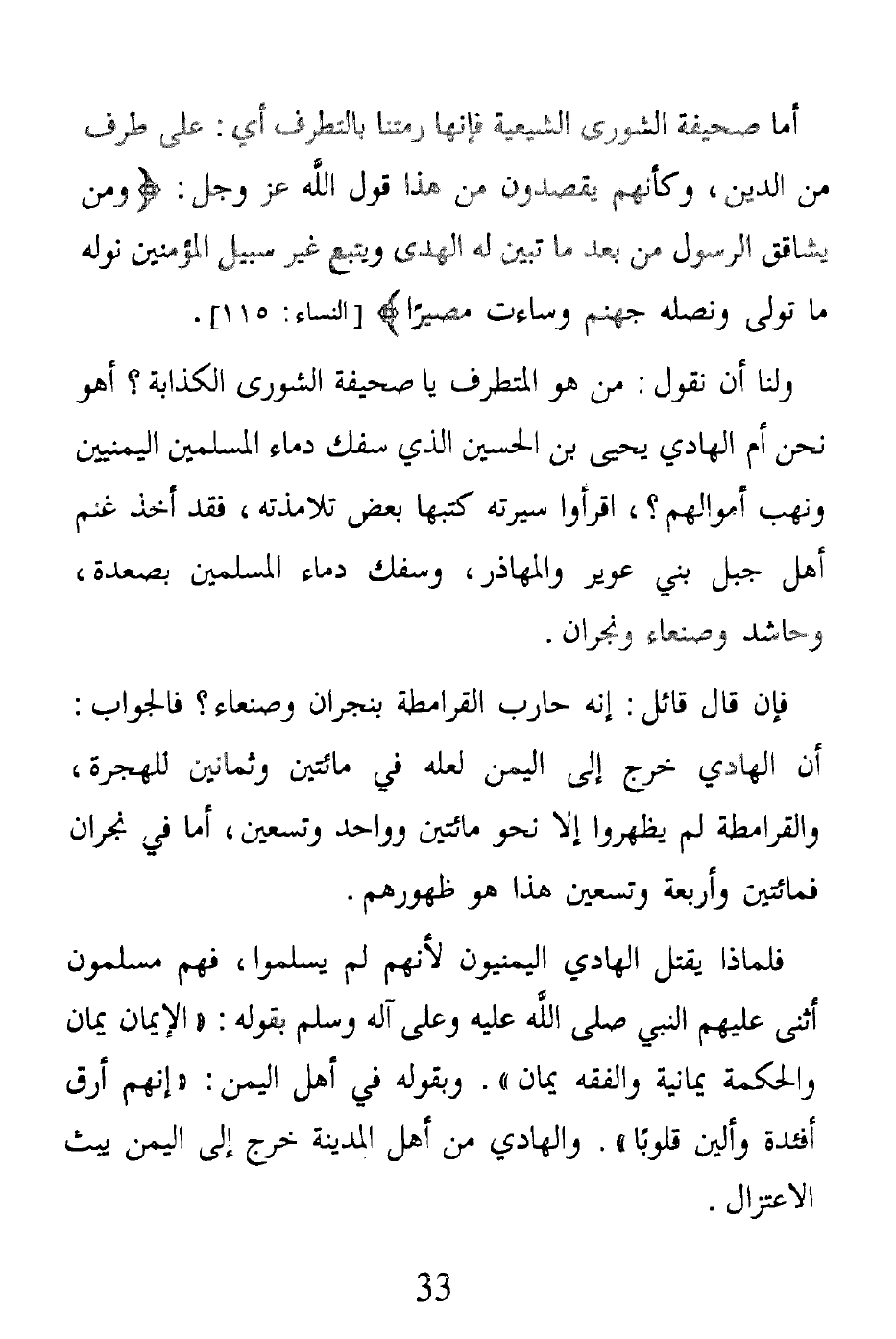 ولنا أن نقول: من هو المتطرف يا صحيفة الشورى الكذابة؟ أهو نحن أم الهادي يحيى بن الحسين الذي سفك دماء المسلمين اليمنيين ونهب أموالهم؟، اقرأوا سيرته كتبها بعض تلامذته، فقد أخذ غنم أهل جبل بني عوير والمهاذر، وسفك دماء المسلمين بصعدة، وحاشد وصنعاء ونجران.