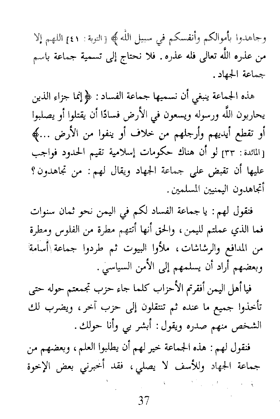 هذه الجماعة ينبغي أن نسميها جماعة الفساد: (إنما جزاء الذين يحاربون الله ورسوله ويسعون في الأرض فسادًا أن يقتلوا أو يصلبوا أو تقطع أيديهم وأرجلهم من خلاف أو ينفوا من الأرض ... ) [المائدة: 33] لو أن هناك حكومات إسلامية تقيم الحدود فواجب عليها أن تقبض على جماعة الجهاد ويقال لهم: من تجاهدون؟ أتجاهدون اليمنيين المسلمين.