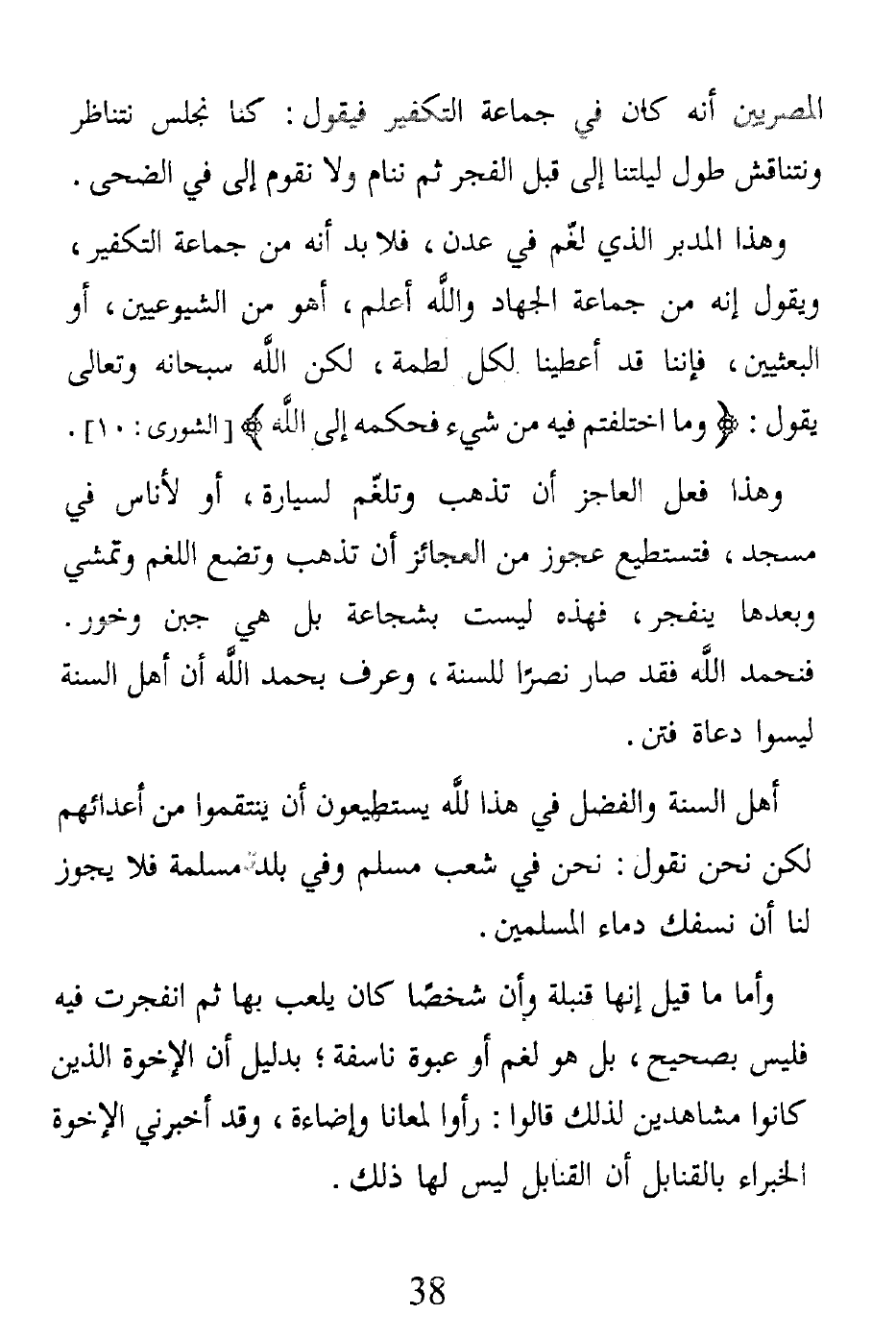 وهذا المدبر الذي لغم في عدن، فلا بد أنه من جماعة التكفير، ويقول إنه من جماعة الجهاد والله أعلم، أهو من الشيوعيين، أو البعثيين، فإننا قد أعطينا لكل لطمة، لكن الله سبحانه وتعالى يقول: (وما اختلفتم فيه من شيء فحكمه إلى الله) [الشورى: 10].
