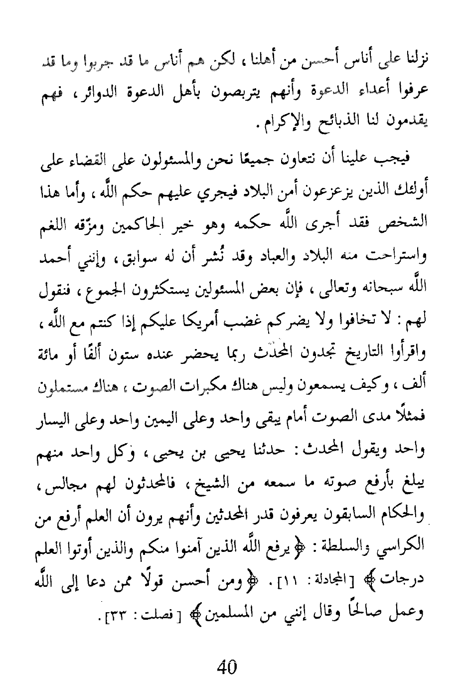 فيجب علينا أن نتعاون جميعًا نحن والمسئولون على القضاء على أولئك الذين يزعزعون أمن البلاد فيجري عليهم حكم الله، وأما هذا الشخص فقد أجرى الله حكمه وهو خير الحاكمين ومزّقه اللغم واستراحت منه البلاد والعباد وقد نُشر أن له سوابق، وإنني أحمد الله سبحانه وتعالى، فإن بعض المسئولين يستكثرون الجموع، فنقول لهم: لا تخافوا ولا يضركم غضب أمريكا عليكم إذا كنتم مع الله، واقرأوا التاريخ تجدون المحدث ربما يحضر عنده ستون ألفًا أو مائة ألف، وكيف يسمعون وليس هناك مكبرات الصوت، هناك مستملون فمثلًا مدى الصوت أمام يبقى واحد وعلى اليمين واحد وعلى اليسار واحد ويقول المحدث: حدثنا يحيى بن يحيى، وكل واحد منهم يبلغ بأرفع صوته ما سمعه من الشيخ، فالمحدثون لهم مجالس، والحكام السابقون يعرفون قدر المحدثين وأنهم يرون أن العلم أرفع من الكراسي والسلطة: (يرفع الله الذين آمنوا منكم والذين أوتوا العلم درجات) [المجادلة: 11]. (ومن أحسن قولًا ممن دعا إلى الله وعمل صالحًا وقال إنني من المسلمين) [فصلت: 33].