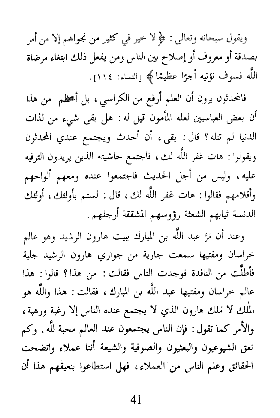 وعند أن مَرَّ عبد الله بن المبارك ببيت هارون الرشيد وهو عالم خراسان ومفتيها سمعت جارية من جواري هارون الرشيد جلبة فأطلت من النافذة فوجدت الناس فقالت: من هذا؟ قالوا: هذا عالم خراسان ومفتيها عبد الله بن المبارك، فقالت: هذا والله هو الملك لا ملك هارون الذي لا يجتمع عنده الناس إلا رغبة ورهبة، والأمر كما تقول: فإن الناس يجتمعون عند العالم محبة لله. وكم نعق الشيوعيون والبعثيون والصوفية والشيعة أننا عملاء واتضحت الحقائق وعلم الناس من العملاء، فهل استطاعوا بنعيقهم هذا أن