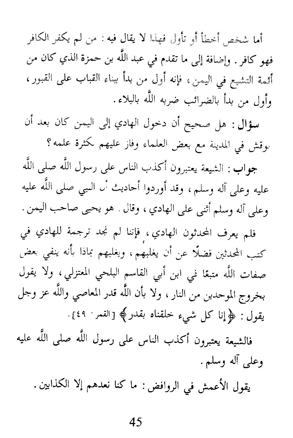 فلم يعرف المحدثون الهادي، فإننا لم نجد ترجمة للهادي في كتب المحدثين فضلًا عن أن يغلبهم، ويغلبهم بماذا بأنه ينفي بعض صفات الله متبعًا في (¬1) ابن أبي القاسم البلخي المعتزلي، ولا يقول بخروج الموحدين من النار، ولا بأن الله قدر المعاصي والله عزوجل يقول: (إنا كل شيء خلقناه بقدر) [القمر: 49].