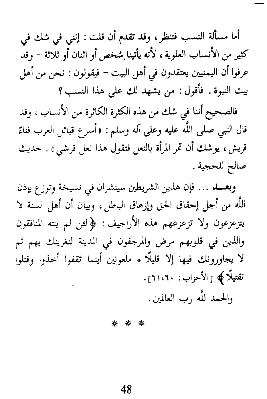 أما مسألة النسب فتنظر، وقد تقدم أن قلت: إنني في شك في كثير من الأنساب العلوية، لأنه يأتينا شخص أو اثنان أو ثلاثة _ وقد عرفوا أن اليمنيين يعتقدون في أهل البيت _ فيقولون: نحن من أهل بيت النبوة. فأقول: من يشهد لك على هذا النسب؟