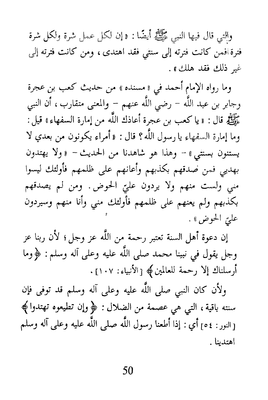 وما رواه الإمام أحمد في (مسنده) من حديث كعب بن عجرة وجابر بن عبد الله _رضي الله عنهم _ والمعنى متقارب، أن النبي صلى الله عليه وعلى آله وسلم قال: (يا كعب بن عجرة أعاذك الله من إمارة السفهاء) قيل: وما إمارة السفهاء يا رسول الله؟ قال: (أمراء يكونون من بعدي لا يستنون بسنتي) _وهذا هو شاهدنا من الحديث _ (ولا يهتدون بهديي فمن صدقهم بكذبهم وأعانهم على ظلمهم فأولئك ليسوا مني ولست منهم ولا يردون عليّ الحوض. ومن لم يصدقهم بكذبهم ولم يعنهم على ظلمهم فأولئك مني وأنا منهم وسيردون عليّ الحوض).