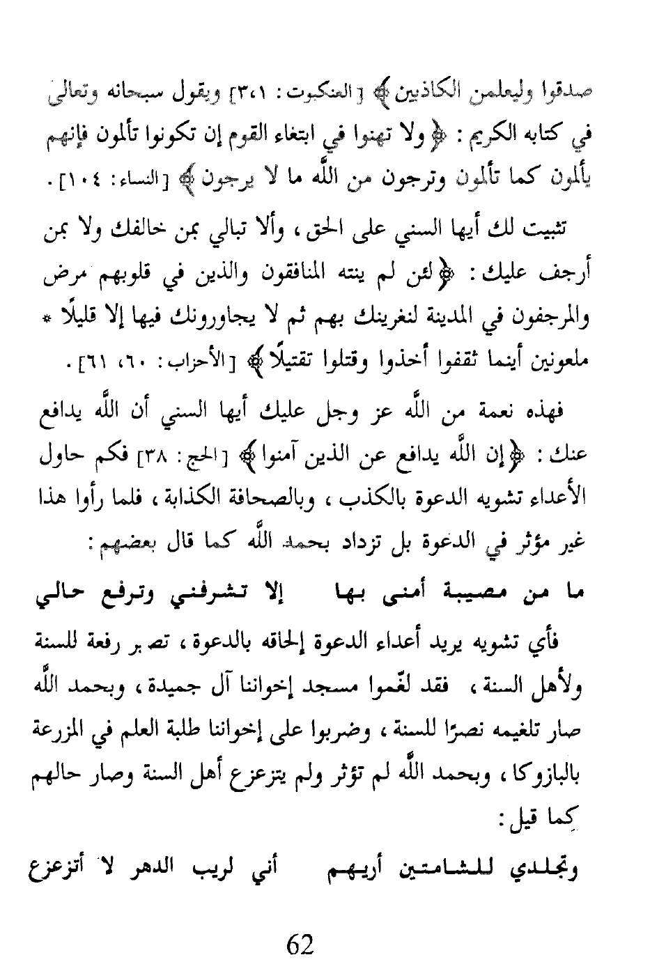تثبيت لك أيها السني على الحق، وألا تبالي بمن خالفك ولا بمن أرجف عليك: (لئن لم ينته المنافقون والذين في قلوبهم مرض والمرجفون في المدينة لنغرينك بهم ثم لا يجاورونك فيها إلا قليلًا * ملعونين أينما ثقفوا أخذوا وقتلوا تقتيلًا) [الأحزاب: 61،60].