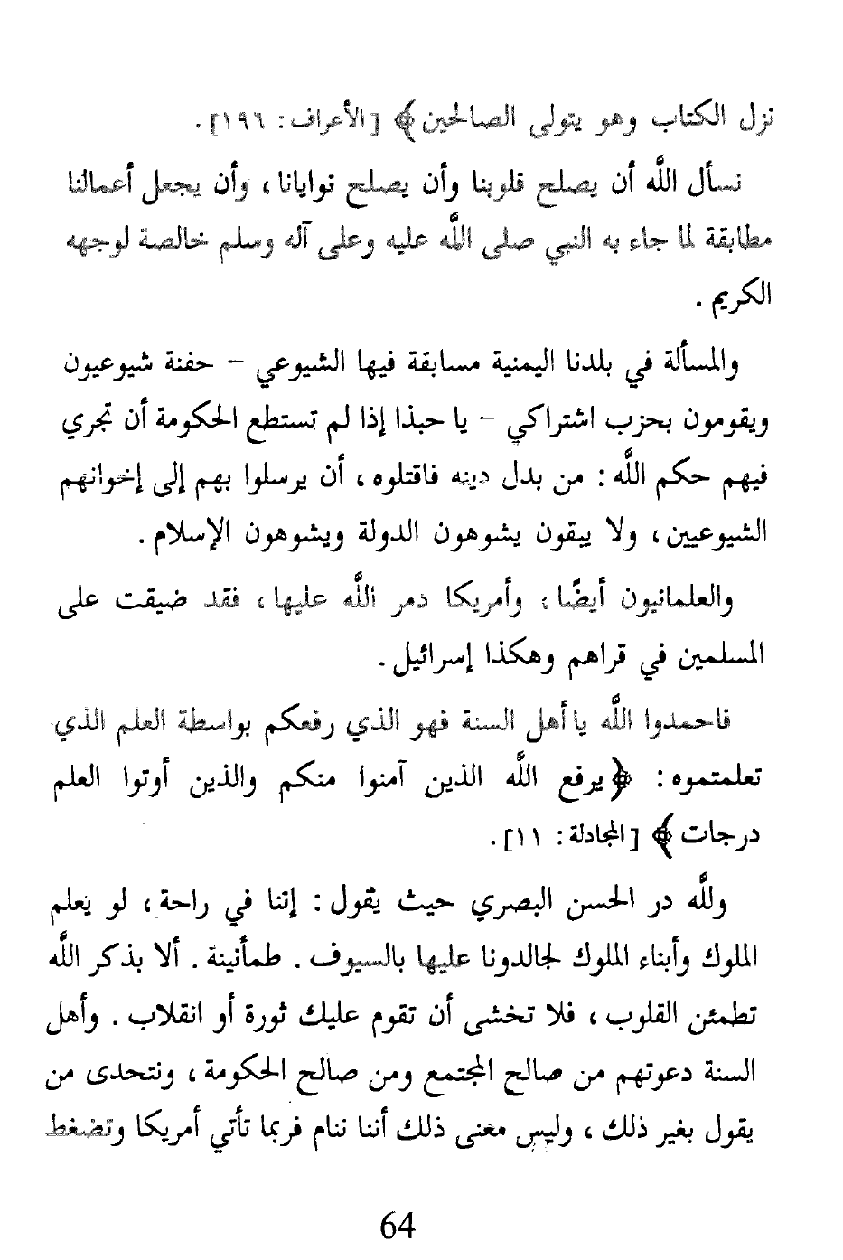 ولله در الحسن البصري حيث يقول: إننا في راحة، لو يعلم الملوك وأبناء الملوك لجالدونا عليها بالسيوف. طمأنينة. ألا بذكر الله تطمئن القلوب، فلا تخشى أن تقوم عليك ثورة أو انقلاب. وأهل السنة دعوتهم من صالح المجتمع ومن صالح الحكومة، ونتحدى من يقول بغير ذلك، وليس معنى ذلك أننا ننام فربما تأتي أمريكا وتضغط