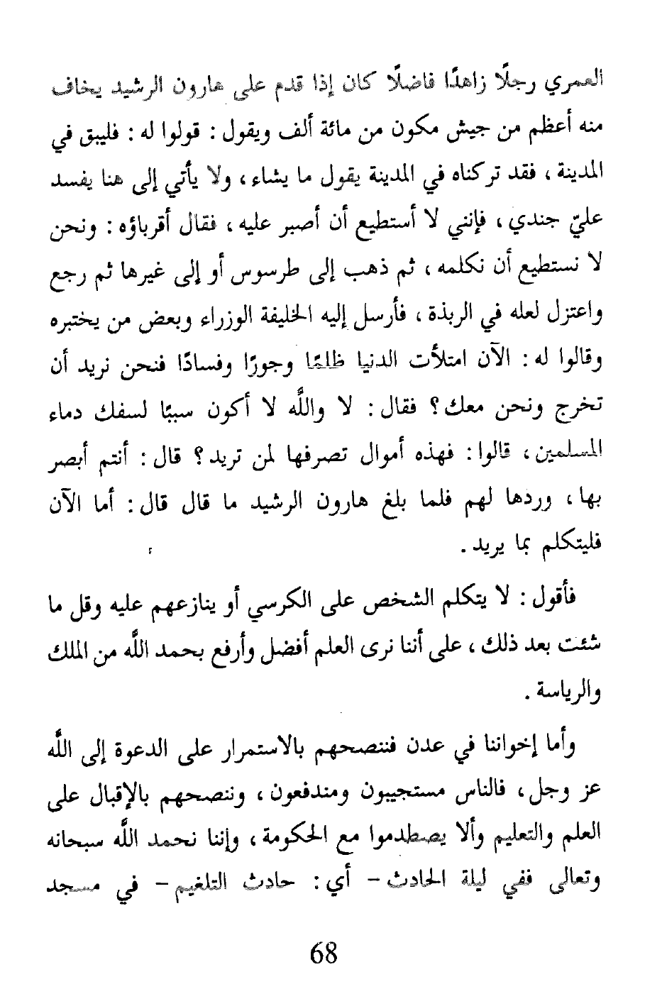 العمري رجلًا زاهدًا فاضلًا كان إذا قدم على هارون الرشيد يخاف منه أعظم من جيش مكون من مائة ألف ويقول: قولوا له فليبق في المدينة، فقد تركناه في المدينة يقول ما يشاء، ولا يأتي إلى هنا يفسد عليّ جندي، فإنني لا أستطيع أن أصبر عليه، فقال أقرباؤه: ونحن لا نستطيع أن نكلمه، ثم ذهب إلى طرسوس أو إلى غيرها ثم رجع واعتزل لعله في الربذة، فأرسل إليه الخليفة الوزراء وبعض من يختبره وقالوا له: الآن امتلأت الدنيا ظلمًا وجورًا وفسادًا فنحن نريد أن تخرج ونحن معك؟ فقال: لا والله لا أكون سببًا لسفك دماء المسلمين، قالوا: فهذه أموال تصرفها لمن تريد؟ قال: أنتم أبصر بها، وردها لهم فلما بلغ هارون الرشيد ما قال قال: أما الآن فليتكلم بما يريد.