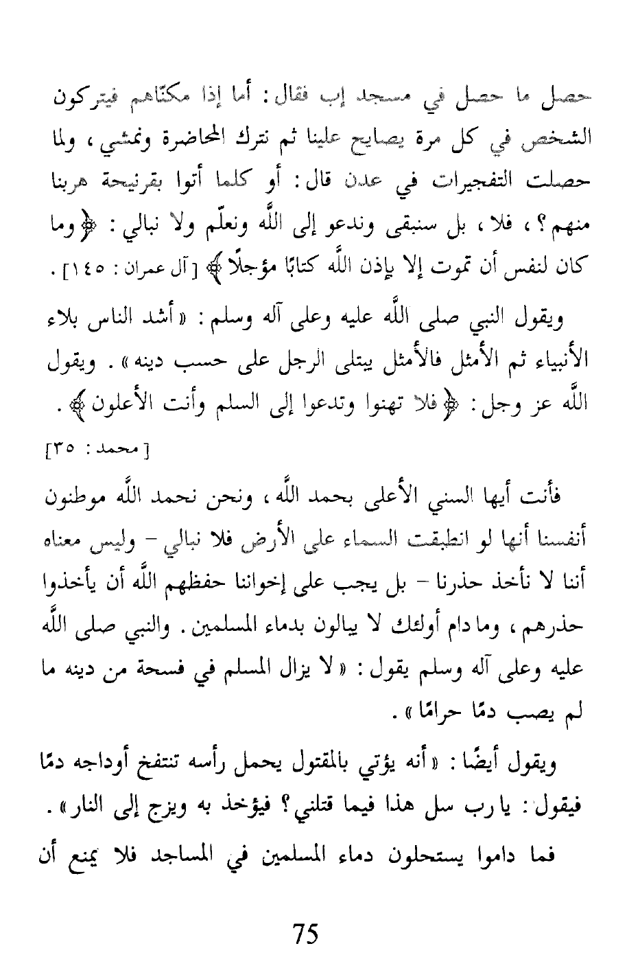حصل ما حصل في مسجد إب فقال: أما إذا مكنّاهم فيتركون الشخص في كل مرة يصايح علينا ثم نترك المحاضرة ونمشي، ولما حصلت التفجيرات في عدن قال: أو كلما أتوا بقرنيحة هربنا منهم؟، فلا، بل سنبقى وندعو إلى الله ونعلّم ولا نبالي: (وما كان لنفس أن تموت إلا بإذن الله كتابًا مؤجلًا) [آل عمران: 145].