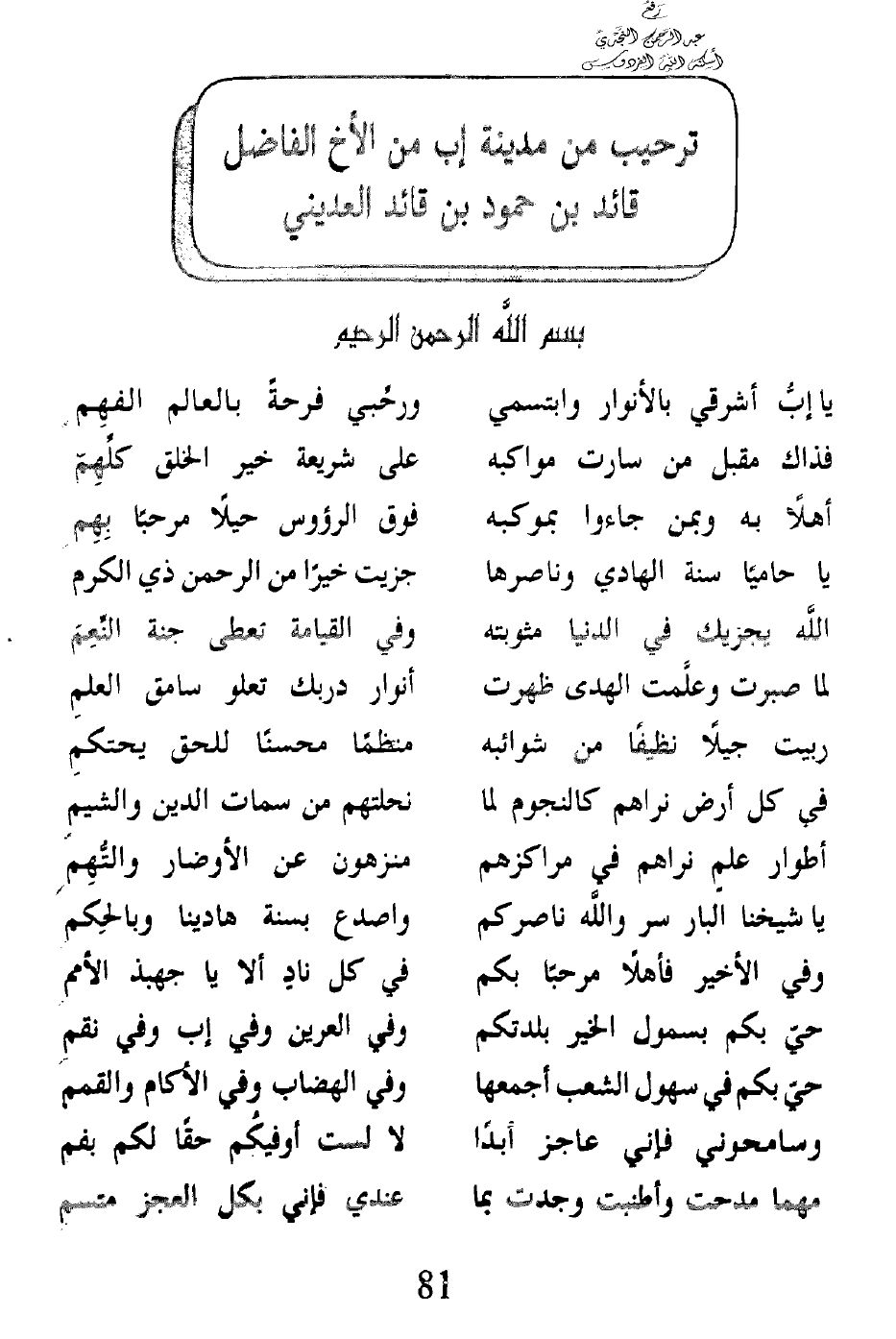 حيّ بكم بسمول الخير بلدتكم ... وفي العرين وفي إب وفي نقم