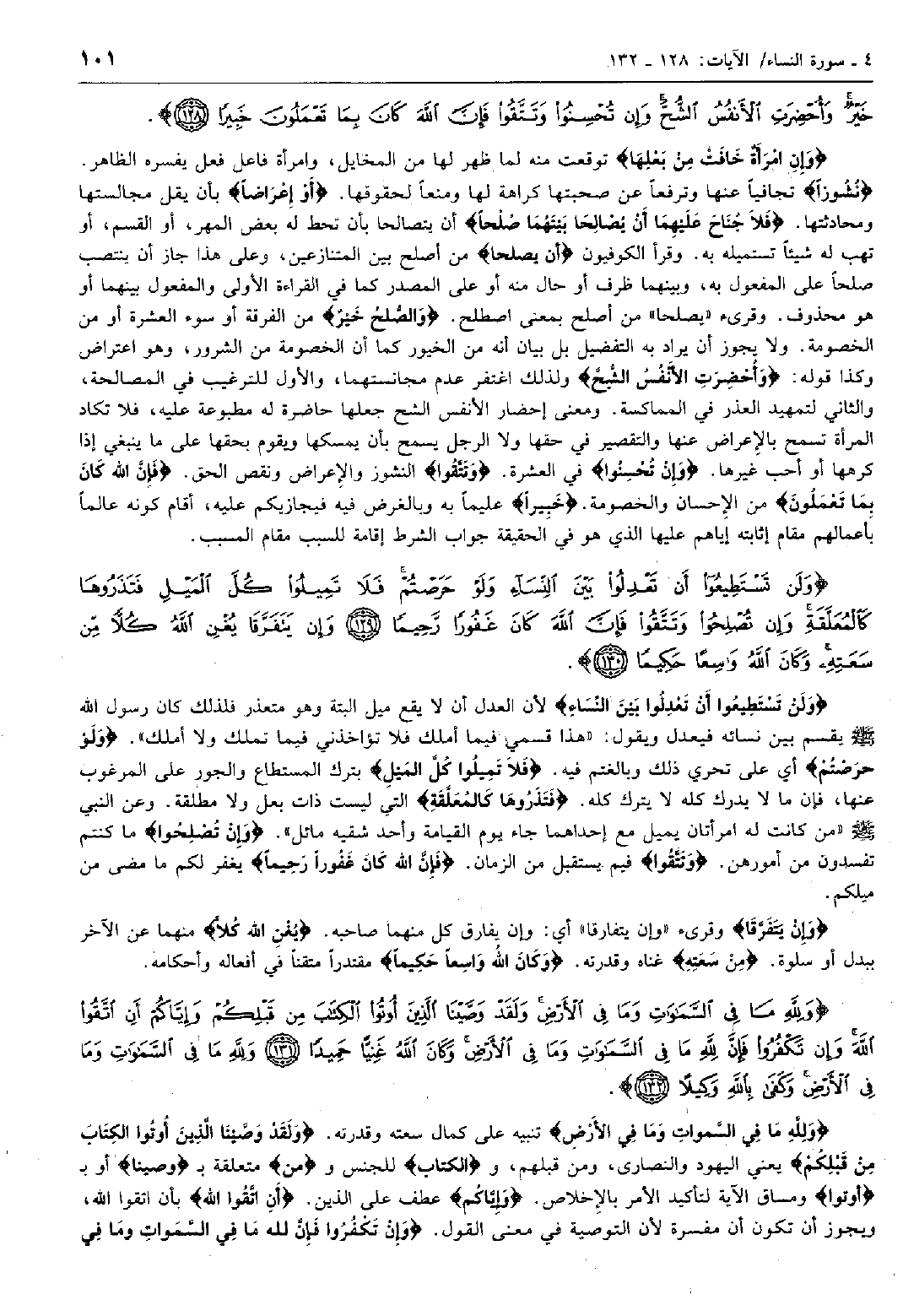 وَلَنْ تَسْتَطِيعُوا أَنْ تَعْدِلُوا بَيْنَ النِّساءِ وَلَوْ حَرَصْتُمْ فَلا تَمِيلُوا كُلَّ الْمَيْلِ فَتَذَرُوها كَالْمُعَلَّقَةِ وَإِنْ تُصْلِحُوا وَتَتَّقُوا فَإِنَّ اللَّهَ كانَ غَفُوراً رَحِيماً (129) وَإِنْ يَتَفَرَّقا يُغْنِ اللَّهُ كُلاًّ مِنْ سَعَتِهِ وَكانَ اللَّهُ واسِعاً حَكِيماً (130)