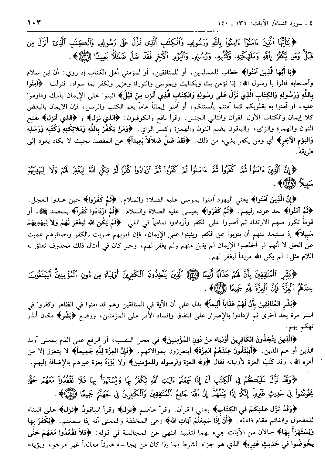 يا أَيُّهَا الَّذِينَ آمَنُوا آمِنُوا بِاللَّهِ وَرَسُولِهِ وَالْكِتابِ الَّذِي نَزَّلَ عَلى رَسُولِهِ وَالْكِتابِ الَّذِي أَنْزَلَ مِنْ قَبْلُ وَمَنْ يَكْفُرْ بِاللَّهِ وَمَلائِكَتِهِ وَكُتُبِهِ وَرُسُلِهِ وَالْيَوْمِ الْآخِرِ فَقَدْ ضَلَّ ضَلالاً بَعِيداً (136)