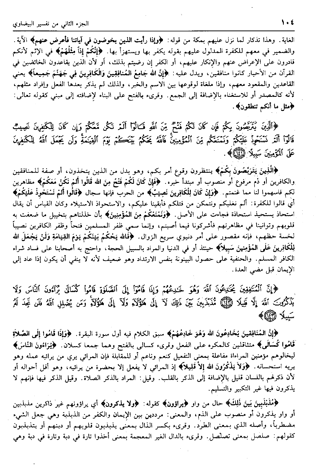 الَّذِينَ يَتَرَبَّصُونَ بِكُمْ فَإِنْ كانَ لَكُمْ فَتْحٌ مِنَ اللَّهِ قالُوا أَلَمْ نَكُنْ مَعَكُمْ وَإِنْ كانَ لِلْكافِرِينَ نَصِيبٌ قالُوا أَلَمْ نَسْتَحْوِذْ عَلَيْكُمْ وَنَمْنَعْكُمْ مِنَ الْمُؤْمِنِينَ فَاللَّهُ يَحْكُمُ بَيْنَكُمْ يَوْمَ الْقِيامَةِ وَلَنْ يَجْعَلَ اللَّهُ لِلْكافِرِينَ عَلَى الْمُؤْمِنِينَ سَبِيلاً (141)