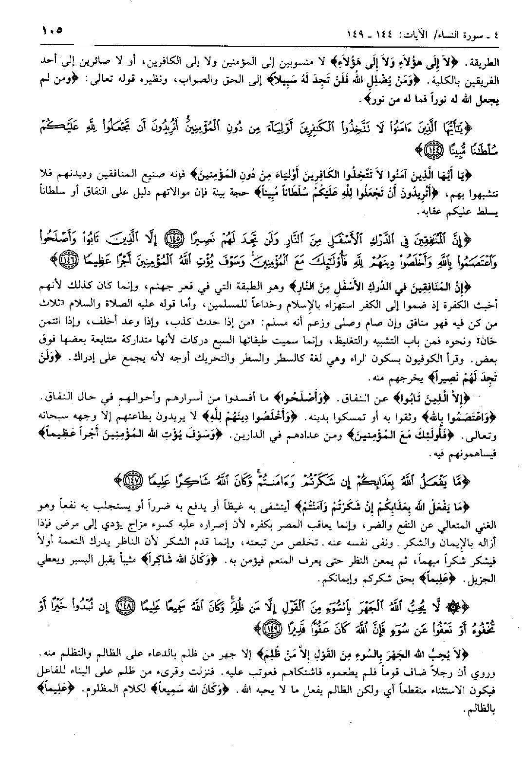 يا أَيُّهَا الَّذِينَ آمَنُوا لاَ تَتَّخِذُوا الْكافِرِينَ أَوْلِياءَ مِنْ دُونِ الْمُؤْمِنِينَ أَتُرِيدُونَ أَنْ تَجْعَلُوا لِلَّهِ عَلَيْكُمْ سُلْطاناً مُبِيناً (144)