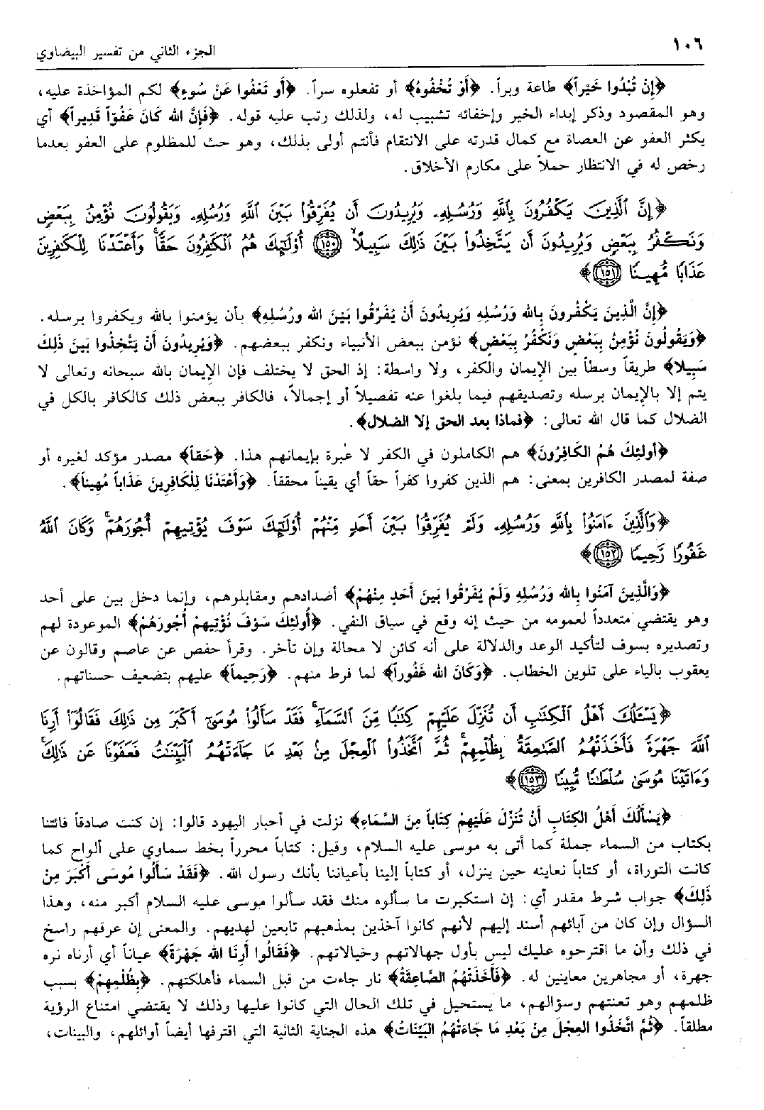 يَسْئَلُكَ أَهْلُ الْكِتابِ أَنْ تُنَزِّلَ عَلَيْهِمْ كِتاباً مِنَ السَّماءِ فَقَدْ سَأَلُوا مُوسى أَكْبَرَ مِنْ ذلِكَ فَقالُوا أَرِنَا اللَّهَ جَهْرَةً فَأَخَذَتْهُمُ الصَّاعِقَةُ بِظُلْمِهِمْ ثُمَّ اتَّخَذُوا الْعِجْلَ مِنْ بَعْدِ مَا جاءَتْهُمُ الْبَيِّناتُ فَعَفَوْنا عَنْ ذلِكَ وَآتَيْنا مُوسى سُلْطاناً مُبِيناً (153)