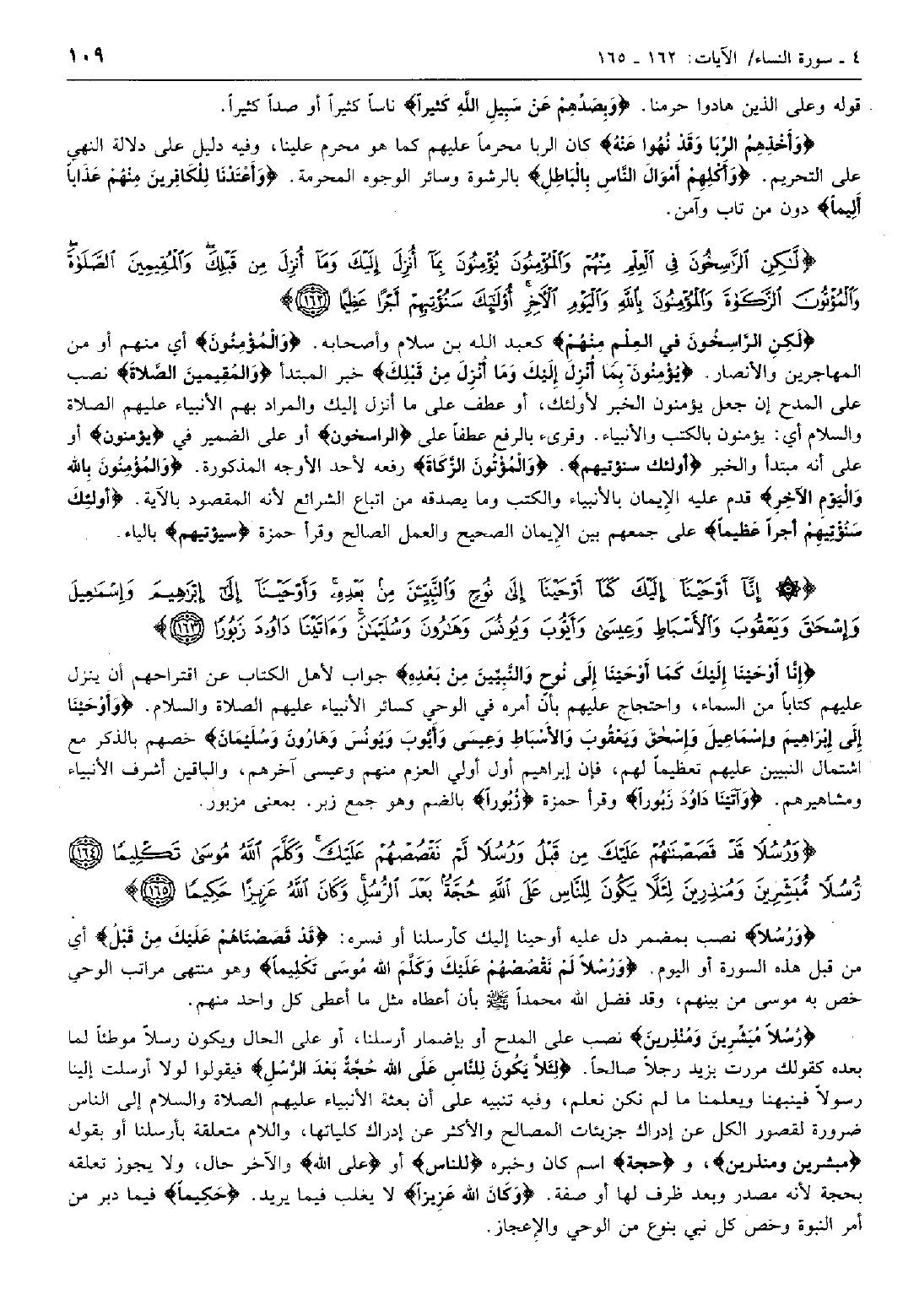 وَرُسُلاً قَدْ قَصَصْناهُمْ عَلَيْكَ مِنْ قَبْلُ وَرُسُلاً لَمْ نَقْصُصْهُمْ عَلَيْكَ وَكَلَّمَ اللَّهُ مُوسى تَكْلِيماً (164) رُسُلاً مُبَشِّرِينَ وَمُنْذِرِينَ لِئَلاَّ يَكُونَ لِلنَّاسِ عَلَى اللَّهِ حُجَّةٌ بَعْدَ الرُّسُلِ وَكانَ اللَّهُ عَزِيزاً حَكِيماً (165)