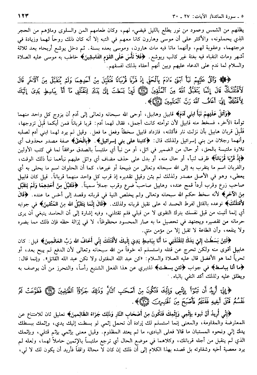 وَاتْلُ عَلَيْهِمْ نَبَأَ ابْنَيْ آدَمَ بِالْحَقِّ إِذْ قَرَّبا قُرْباناً فَتُقُبِّلَ مِنْ أَحَدِهِما وَلَمْ يُتَقَبَّلْ مِنَ الْآخَرِ قالَ لَأَقْتُلَنَّكَ قالَ إِنَّما يَتَقَبَّلُ اللَّهُ مِنَ الْمُتَّقِينَ (27) لَئِنْ بَسَطْتَ إِلَيَّ يَدَكَ لِتَقْتُلَنِي مَا أَنَا بِباسِطٍ يَدِيَ إِلَيْكَ لِأَقْتُلَكَ إِنِّي أَخافُ اللَّهَ رَبَّ الْعالَمِينَ (28)