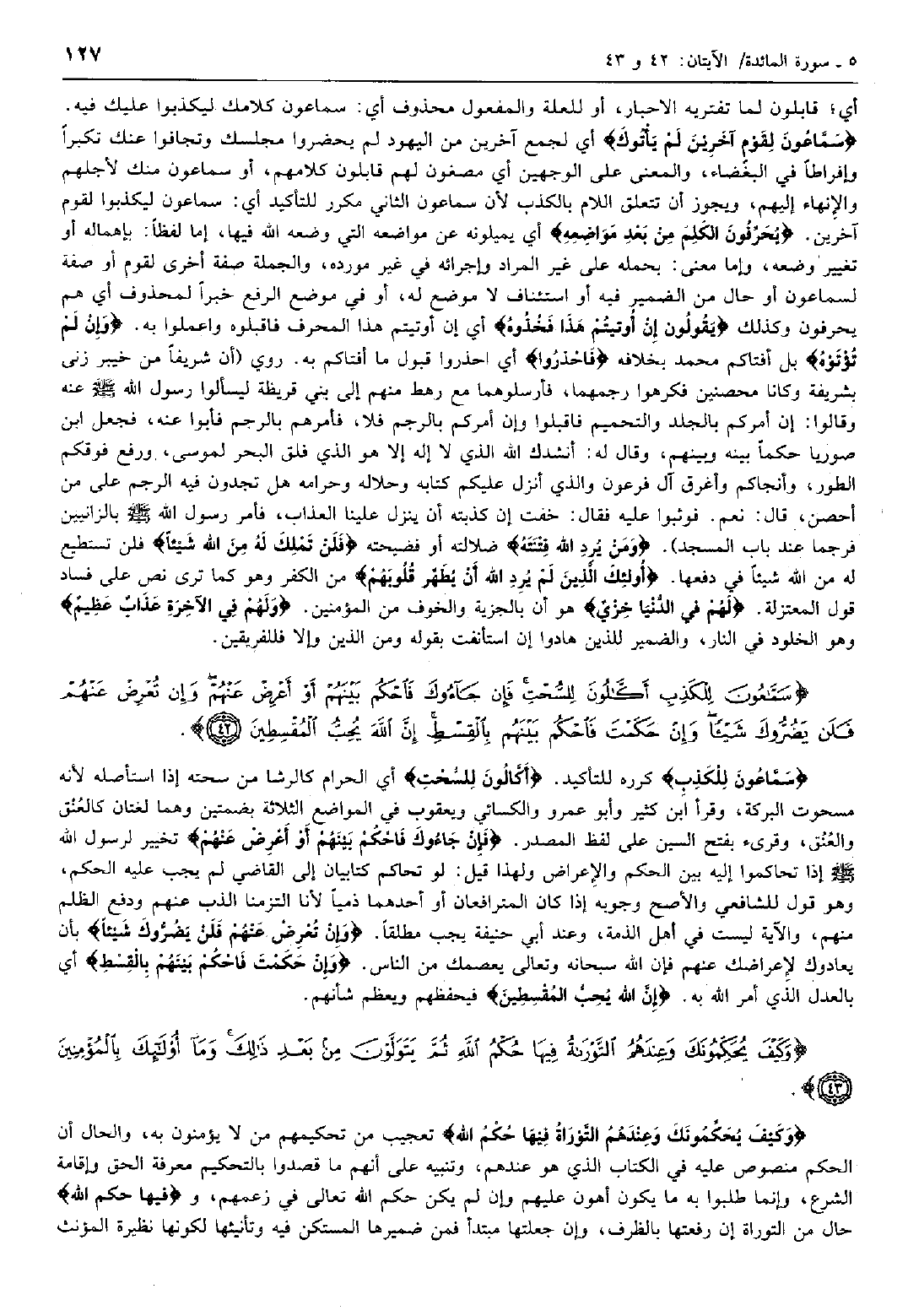سَمَّاعُونَ لِلْكَذِبِ أَكَّالُونَ لِلسُّحْتِ فَإِنْ جاؤُكَ فَاحْكُمْ بَيْنَهُمْ أَوْ أَعْرِضْ عَنْهُمْ وَإِنْ تُعْرِضْ عَنْهُمْ فَلَنْ يَضُرُّوكَ شَيْئاً وَإِنْ حَكَمْتَ فَاحْكُمْ بَيْنَهُمْ بِالْقِسْطِ إِنَّ اللَّهَ يُحِبُّ الْمُقْسِطِينَ (42)