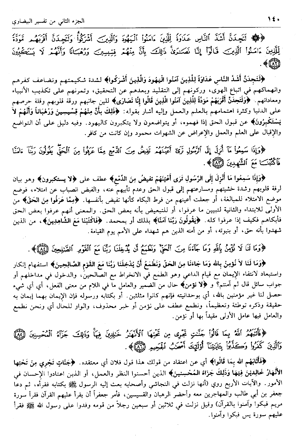 لَتَجِدَنَّ أَشَدَّ النَّاسِ عَداوَةً لِلَّذِينَ آمَنُوا الْيَهُودَ وَالَّذِينَ أَشْرَكُوا لشدة شكيمتهم وتضاعف كفرهم وانهماكهم في اتباع الهوى، وركونهم إلى التقليد وبعدهم عن التحقيق، وتمرنهم على تكذيب الأنبياء ومعاداتهم. وَلَتَجِدَنَّ أَقْرَبَهُمْ مَوَدَّةً لِلَّذِينَ آمَنُوا الَّذِينَ قالُوا إِنَّا نَصارى للين جانبهم ورقة قلوبهم وقلة حرصهم على الدنيا وكثرة اهتمامهم بالعلم والعمل وإليه أشار بقوله: ذلِكَ بِأَنَّ مِنْهُمْ قِسِّيسِينَ وَرُهْباناً وَأَنَّهُمْ لاَ يَسْتَكْبِرُونَ عن قبول الحق إذا فهموه، أو يتواضعون ولا يتكبرون كاليهود. وفيه دليل على أن التواضع والإِقبال على العلم والعمل والإِعراض عن الشهوات محمود وإن كانت من كافر.