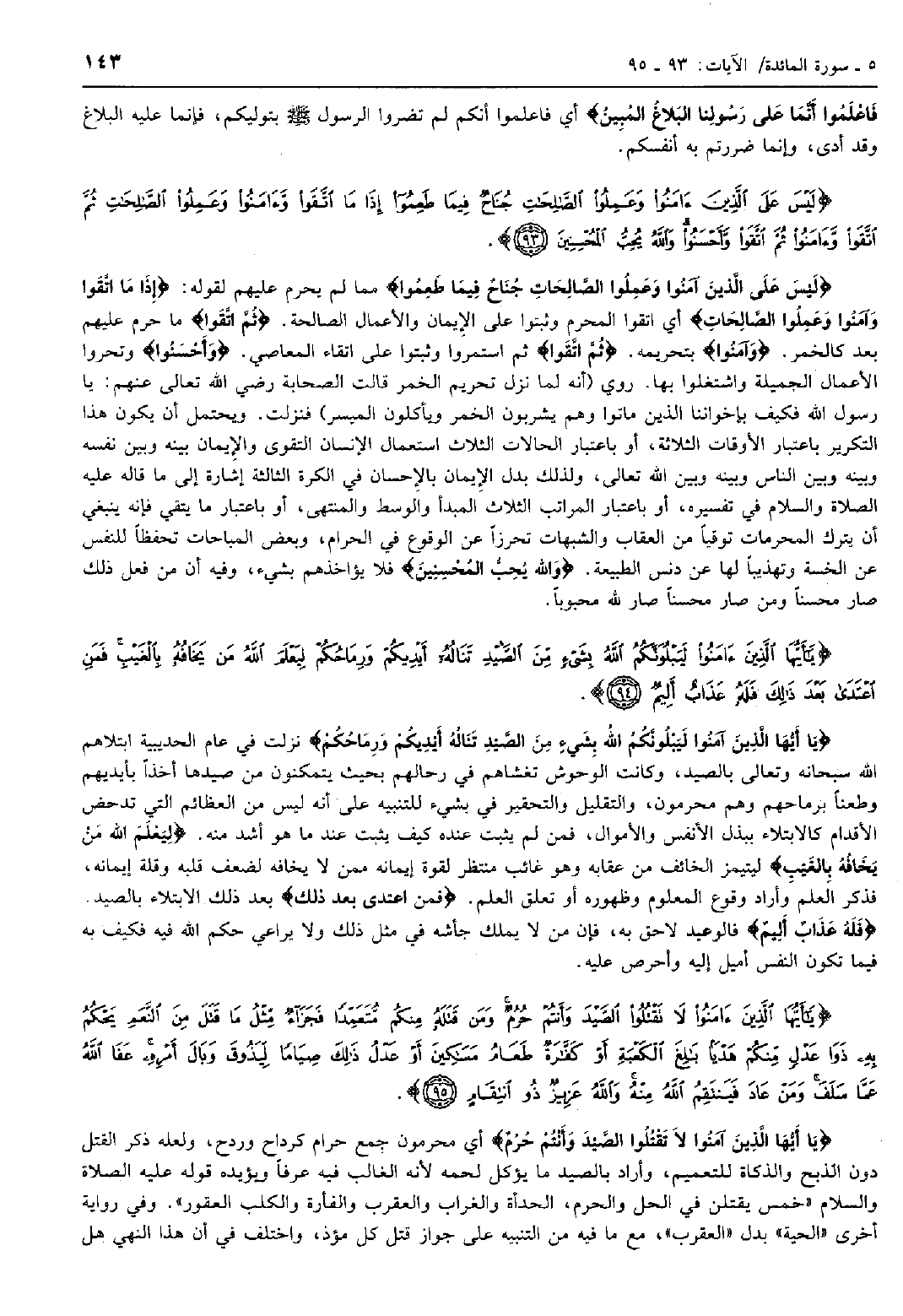 يا أَيُّهَا الَّذِينَ آمَنُوا لاَ تَقْتُلُوا الصَّيْدَ وَأَنْتُمْ حُرُمٌ وَمَنْ قَتَلَهُ مِنْكُمْ مُتَعَمِّداً فَجَزاءٌ مِثْلُ مَا قَتَلَ مِنَ النَّعَمِ يَحْكُمُ بِهِ ذَوا عَدْلٍ مِنْكُمْ هَدْياً بالِغَ الْكَعْبَةِ أَوْ كَفَّارَةٌ طَعامُ مَساكِينَ أَوْ عَدْلُ ذلِكَ صِياماً لِيَذُوقَ وَبالَ أَمْرِهِ عَفَا اللَّهُ عَمَّا سَلَفَ وَمَنْ عادَ فَيَنْتَقِمُ اللَّهُ مِنْهُ وَاللَّهُ عَزِيزٌ ذُو انْتِقامٍ (95)