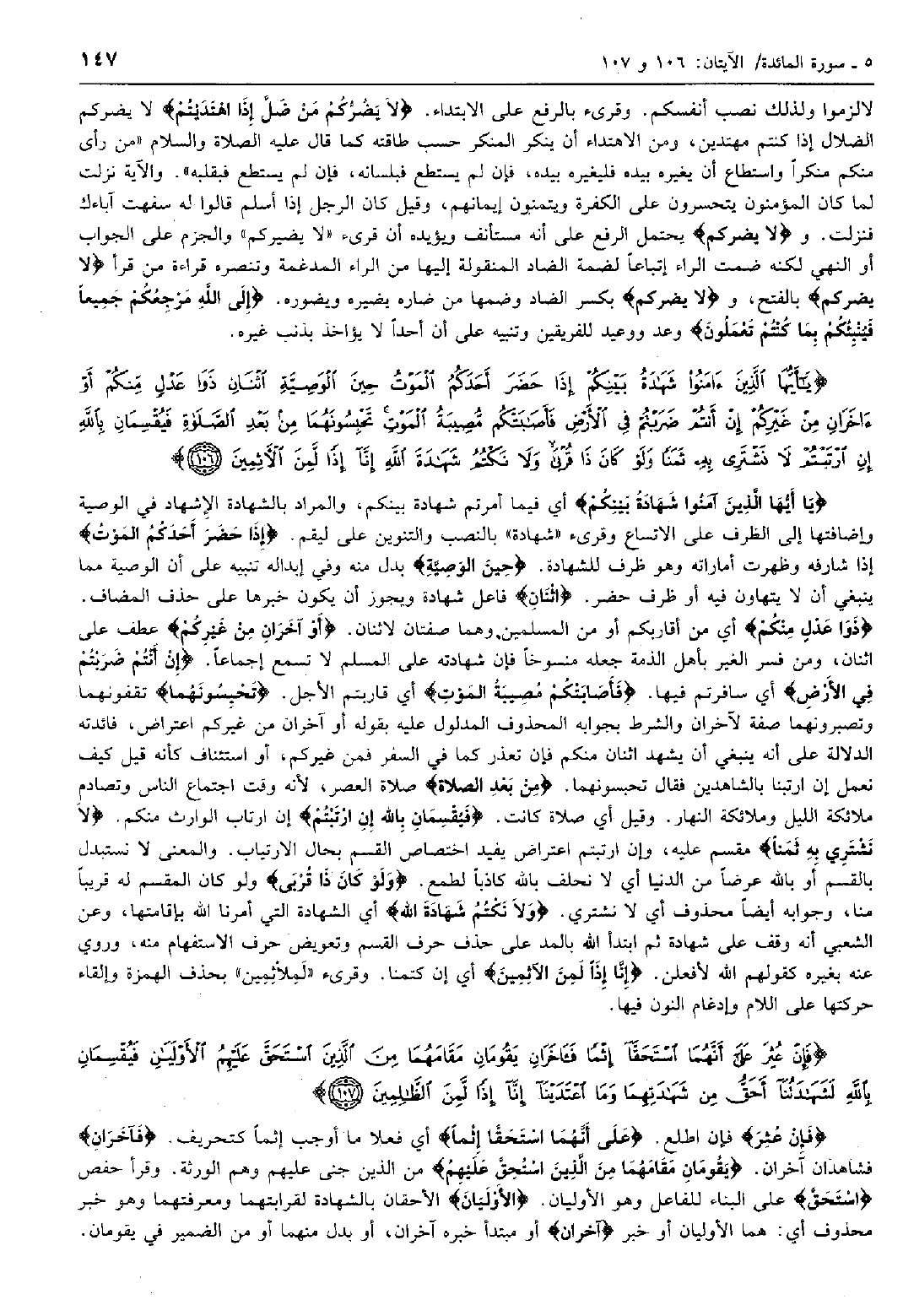 يا أَيُّهَا الَّذِينَ آمَنُوا شَهادَةُ بَيْنِكُمْ إِذا حَضَرَ أَحَدَكُمُ الْمَوْتُ حِينَ الْوَصِيَّةِ اثْنانِ ذَوا عَدْلٍ مِنْكُمْ أَوْ آخَرانِ مِنْ غَيْرِكُمْ إِنْ أَنْتُمْ ضَرَبْتُمْ فِي الْأَرْضِ فَأَصابَتْكُمْ مُصِيبَةُ الْمَوْتِ تَحْبِسُونَهُما مِنْ بَعْدِ الصَّلاةِ فَيُقْسِمانِ بِاللَّهِ إِنِ ارْتَبْتُمْ لاَ نَشْتَرِي بِهِ ثَمَناً وَلَوْ كانَ ذَا قُرْبى وَلا نَكْتُمُ شَهادَةَ اللَّهِ إِنَّا إِذاً لَمِنَ الْآثِمِينَ (106)