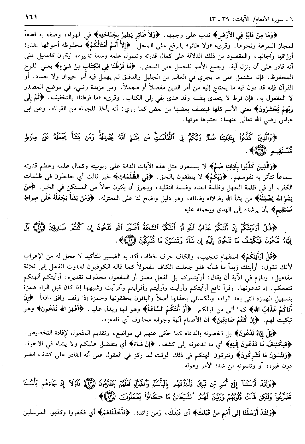 محفوظة أحوالها مقدرة أرزاقها وآجالها، والمقصود من ذلك الدلالة على كمال قدرته وشمول علمه وسعة تدبيره، ليكون كالدليل على أنه قادر على أن ينزل آية. وجمع الأمم للحمل على المعنى. مَّا فَرَّطْنا فِي الْكِتابِ مِنْ شَيْءٍ يعني اللوح المحفوظ، فإنه مشتمل على ما يجري في العالم من الجليل والدقيق لم يهمل فيه أمر حيوان ولا جماد. أو القرآن فإنه قد دون فيه ما يحتاج إليه من أمر الدين مفصلاً أو مجملاً، ومن مزيدة وشيء في موضع المصدر لا المفعول به، فإن فرط لا يتعدى بنفسه وقد عدي بفي إلى الكتاب. وقرئ «مَّا فَرَّطْنَا» بالتخفيف. ثُمَّ إِلى رَبِّهِمْ يُحْشَرُونَ يعني الأمم كلها فينصف بعضها من بعض كما