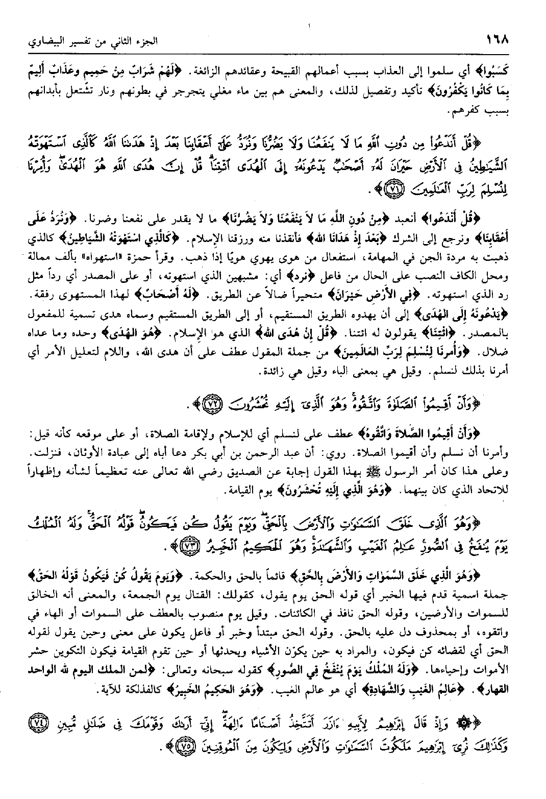 وَهُوَ الَّذِي خَلَقَ السَّماواتِ وَالْأَرْضَ بِالْحَقِّ قائماً بالحق والحكمة. وَيَوْمَ يَقُولُ كُنْ فَيَكُونُ قَوْلُهُ الْحَقُّ جملة اسمية قدم فيها الخبر أي قوله الحق يوم يقول، كقولك: القتال يوم الجمعة، والمعنى أنه الخالق للسموات والأرضين، وقوله الحق نافذ في الكائنات. وقيل يوم منصوب بالعطف على السموات أو الهاء في واتقوه، أو بمحذوف دل عليه بالحق. وقوله الحق مبتدأ وخبر أو فاعل يكون على معنى وحين يقول لقوله الحق أي لقضائه كن فيكون، والمراد به حين يكون الأشياء ويحدثها أو حين تقوم القيامة فيكون التكوين حشر الأموات وإحياءها. وَلَهُ الْمُلْكُ يَوْمَ يُنْفَخُ فِي الصُّورِ كقوله سبحانه وتعالى: لِمَنِ الْمُلْكُ الْيَوْمَ لِلَّهِ الْواحِدِ الْقَهَّارِ. عالِمُ الْغَيْبِ وَالشَّهادَةِ أي هو عالم الغيب. وَهُوَ الْحَكِيمُ الْخَبِيرُ كالفذلكة للآية.