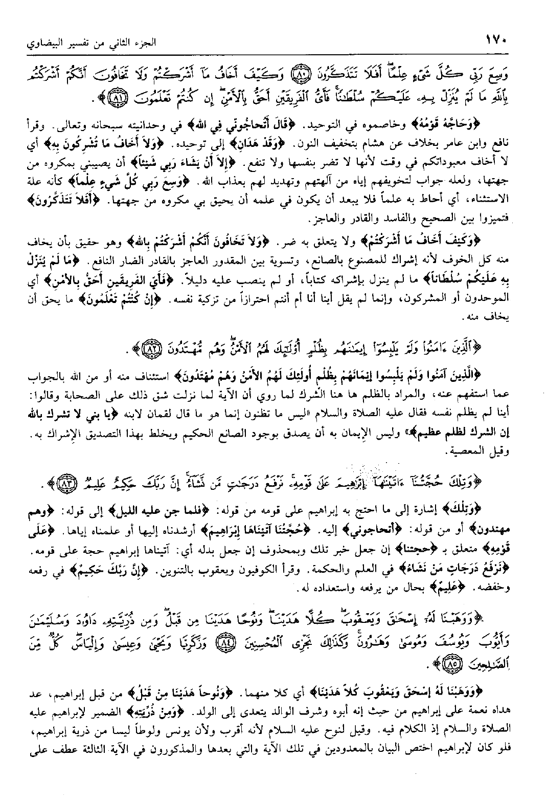 وَحاجَّهُ قَوْمُهُ وخاصموه في التوحيد. قالَ أَتُحاجُّونِّي فِي اللَّهِ في وحدانيته سبحانه وتعالى. وقرأ نافع وابن عامر بخلاف عن هشام بتخفيف النون. وَقَدْ هَدانِ إلى توحيده. وَلا أَخافُ مَا تُشْرِكُونَ بِهِ أي لا أخاف معبوداتكم في وقت لأنها لا تضر بنفسها ولا تنفع. إِلَّا أَنْ يَشاءَ رَبِّي شَيْئاً أن يصيبني بمكروه من جهتها، ولعله جواب لتخويفهم إياه من آلهتهم وتهديد لهم بعذاب الله. وَسِعَ رَبِّي كُلَّ شَيْءٍ عِلْماً كأنه علة الاستثناء، أي أحاط به علماً فلا يبعد أن يكون في علمه أن يحيق بي مكروه من جهتها. أَفَلا تَتَذَكَّرُونَ فتميزوا بين الصحيح والفاسد والقادر والعاجز.