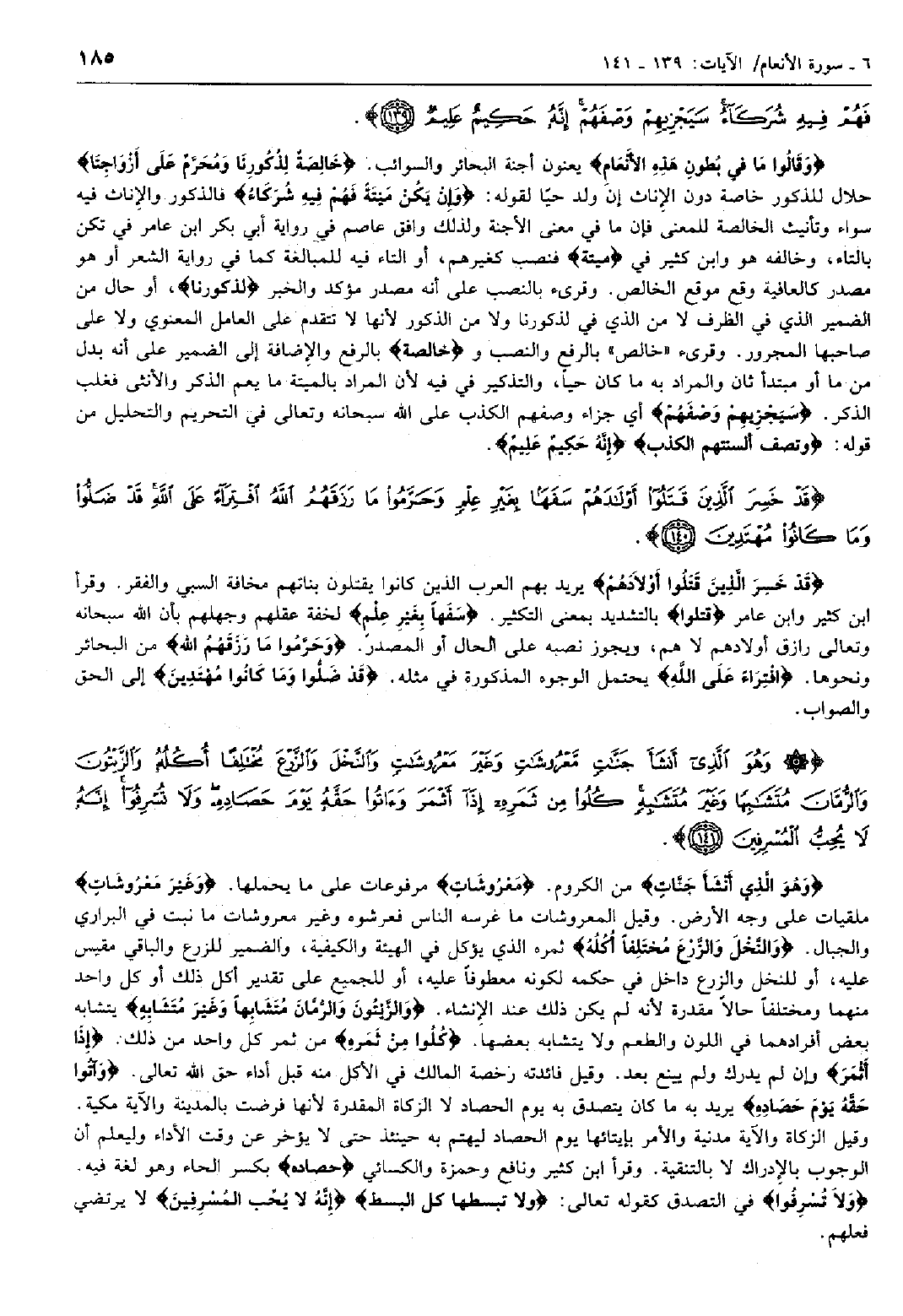 وَهُوَ الَّذِي أَنْشَأَ جَنَّاتٍ مَعْرُوشاتٍ وَغَيْرَ مَعْرُوشاتٍ وَالنَّخْلَ وَالزَّرْعَ مُخْتَلِفاً أُكُلُهُ وَالزَّيْتُونَ وَالرُّمَّانَ مُتَشابِهاً وَغَيْرَ مُتَشابِهٍ كُلُوا مِنْ ثَمَرِهِ إِذا أَثْمَرَ وَآتُوا حَقَّهُ يَوْمَ حَصادِهِ وَلا تُسْرِفُوا إِنَّهُ لاَ يُحِبُّ الْمُسْرِفِينَ (141)