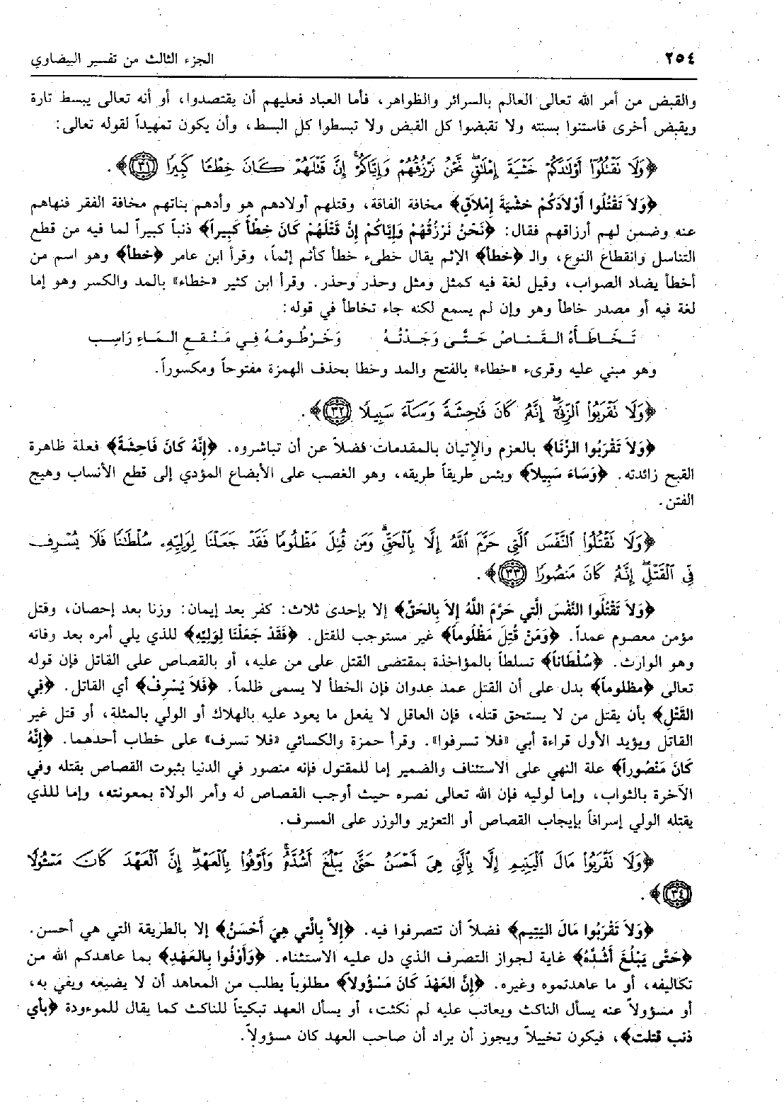 وَلا تَقْتُلُوا النَّفْسَ الَّتِي حَرَّمَ اللَّهُ إِلَّا بِالْحَقِّ إلا بإحدى ثلاث: كفر بعد إيمان: وزنا بعد إحصان، وقتل مؤمن معصوم عمداً. وَمَنْ قُتِلَ مَظْلُوماً غير مستوجب للقتل. فَقَدْ جَعَلْنا لِوَلِيِّهِ للذي يلي أمره بعد وفاته وهو الوارث. سُلْطاناً تسلطاً بالمؤاخذة بمقتضى القتل على من عليه، أو بالقصاص على القاتل فإن قوله تعالى مَظْلُوماً بدل على أن القتل عمد عدوان فإن الخطأ لا يسمى ظلماً. فَلا يُسْرِفْ أي القاتل. فِي الْقَتْلِ بأن يقتل من لا يستحق قتله، فإن العاقل لا يفعل ما يعود عليه بالهلاك أو الولي بالمثلة، أو قتل غير القاتل ويؤيد الأول قراءة أبي «فلا تسرفوا» . وقرأ حمزة والكسائي «فلا تسرف» على خطاب أحدهما. إِنَّهُ كانَ مَنْصُوراً علة النهي على الاستئناف والضمير إما للمقتول فإنه منصور في الدنيا بثبوت القصاص بقتله وفي الآخرة بالثواب، وإما لوليه فإن الله تعالى نصره حيث أوجب القصاص له وأمر الولاة بمعونته، وإما للذي يقتله الولي إسرافاً بإيجاب القصاص أو التعزير والوزر على المسرف.