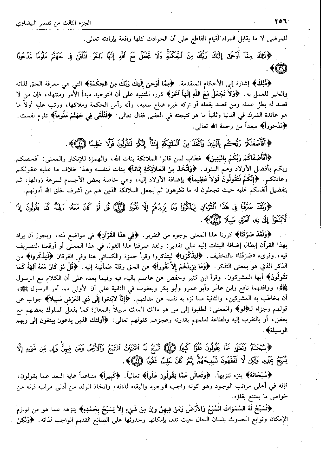 وَلَقَدْ صَرَّفْنا كررنا هذا المعنى بوجوه من التقرير. فِي هذَا الْقُرْآنِ في مواضع منه، ويجوز أن يراد بهذا القرآن إبطال إضافة البنات إليه على تقدير: ولقد صرفنا هذا القول في هذا المعنى أو أوقعنا التصريف فيه، وقرئ «صَرَفْنَا» بالتخفيف. لِيَذَّكَّرُوا ليتذكروا وقرأ حمزة والكسائي هنا وفي الفرقان لِيَذَّكَّرُوا من الذكر الذي هو بمعنى التذكر. وَما يَزِيدُهُمْ إِلَّا نُفُوراً عن الحق وقلة طمأنينة إليه. قُلْ لَّوْ كان معه آلهة كما تَقُولُونَ أيها المشركون، وقرأ ابن كثير وحفص عن عاصم بالياء فيه وفيما بعده على أن الكلام مع الرسول صلّى الله عليه وسلّم، ووافقهما نافع وابن عامر وأبو عمرو وأبو بكر ويعقوب في الثانية على أن الأولى مما أمر الرسول صلّى الله عليه وسلّم، أن يخاطب به المشركين، والثانية مما نزه به نفسه عن مقالتهم. إِذاً لَابْتَغَوْا إِلى ذِي الْعَرْشِ سَبِيلًا جواب عن قولهم وجزاء ل لَوْ والمعنى: لطلبوا إلى من هو مالك الملك سبيلاً بالمعازة كما يفعل الملوك بعضهم مع بعض، أو بالتقرب إليه والطاعة لعلمهم بقدرته وعجزهم كقولهم تعالى: أُولئِكَ الَّذِينَ يَدْعُونَ يَبْتَغُونَ إِلى رَبِّهِمُ الْوَسِيلَةَ.