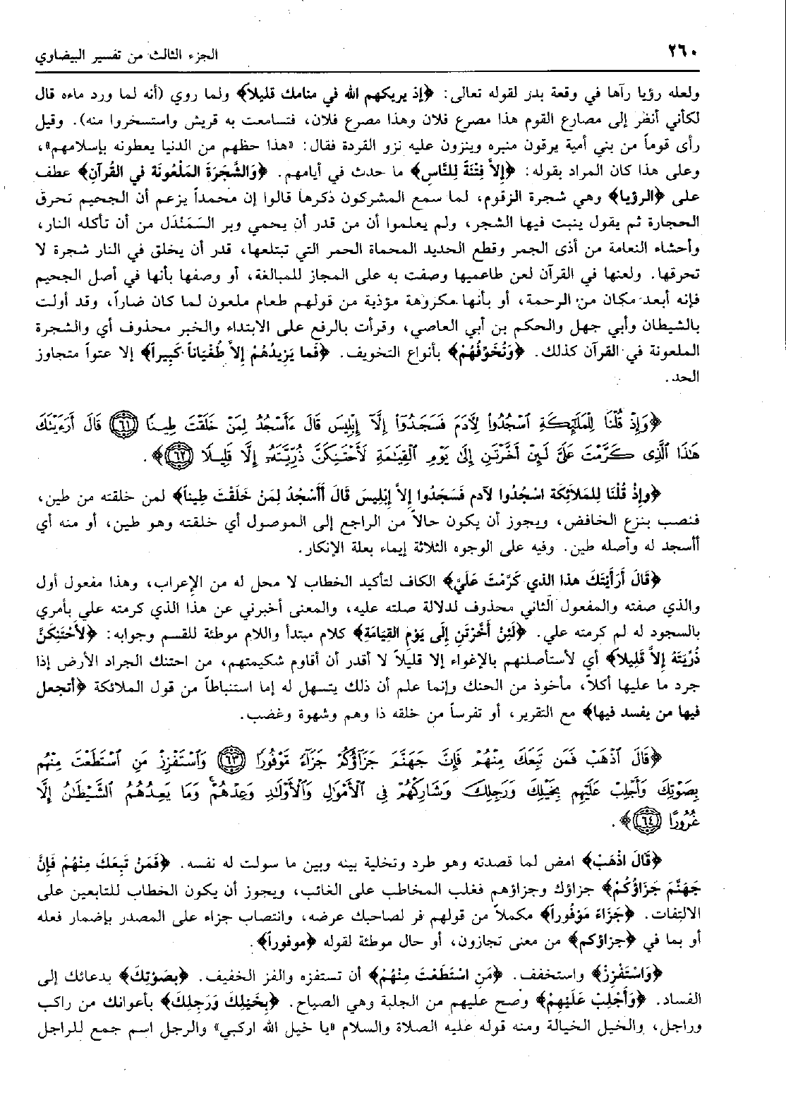 وقيل رأى قوماً من بني أمية يرقون منبره وينزون عليه نزو القردة فقال: «هذا حظهم من الدنيا يعطونه بإسلامهم» ، وعلى هذا كان المراد بقوله: إِلَّا فِتْنَةً لِلنَّاسِ ما حدث في أيامهم. وَالشَّجَرَةَ الْمَلْعُونَةَ فِي الْقُرْآنِ عطف على الرُّؤْيَا وهي شجرة الزقوم، لما سمع المشركون ذكرها قالوا إن محمداً يزعم أن الجحيم تحرق الحجارة ثم يقول ينبت فيها الشجر، ولم يعلموا أن من قدر أن يحمي وبر السَمَنْدَل من أن تأكله النار، وأحشاء النعامة من أذى الجمر وقطع الحديد المحماة الحمر التي تبتلعها، قدر أن يخلق في النار شجرة لا تحرقها. ولعنها في القرآن لعن طاعميها وصفت به على المجاز للمبالغة، أو وصفها بأنها في أصل الجحيم فإنه أبعد مكان من الرحمة، أو بأنها مكروهة مؤذية من قولهم طعام ملعون لما كان ضاراً، وقد أولت بالشيطان وأبي جهل والحكم بن أبي العاصي، وقرأت بالرفع على الابتداء والخبر محذوف أي والشجرة الملعونة في القرآن كذلك. وَنُخَوِّفُهُمْ بأنواع التخويف. فَما يَزِيدُهُمْ إِلَّا طُغْياناً كَبِيراً إلا عتواً متجاوز الحد.