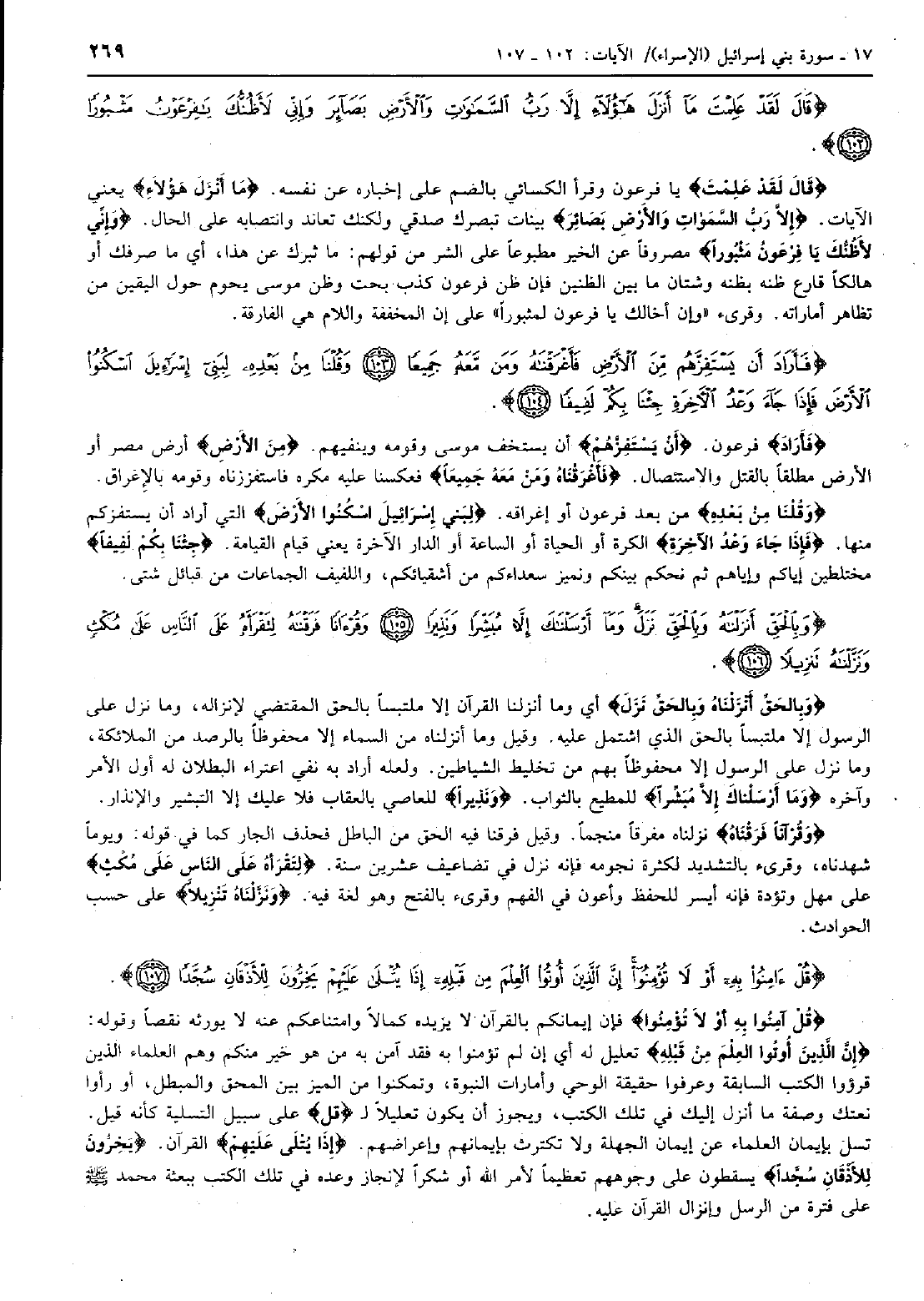 وَبِالْحَقِّ أَنْزَلْناهُ وَبِالْحَقِّ نَزَلَ وَما أَرْسَلْناكَ إِلاَّ مُبَشِّراً وَنَذِيراً (105) وَقُرْآناً فَرَقْناهُ لِتَقْرَأَهُ عَلَى النَّاسِ عَلى مُكْثٍ وَنَزَّلْناهُ تَنْزِيلاً (106)