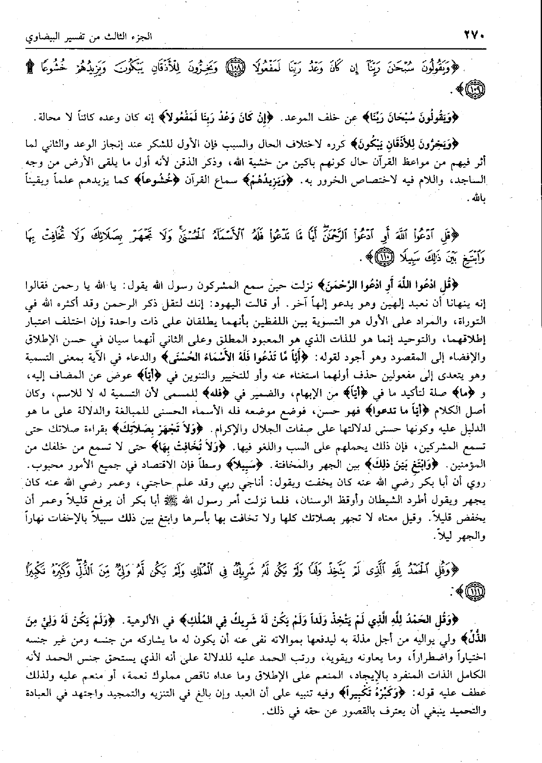 وَقُلِ الْحَمْدُ لِلَّهِ الَّذِي لَمْ يَتَّخِذْ وَلَداً وَلَمْ يَكُنْ لَهُ شَرِيكٌ فِي الْمُلْكِ وَلَمْ يَكُنْ لَهُ وَلِيٌّ مِنَ الذُّلِّ وَكَبِّرْهُ تَكْبِيراً (111)
